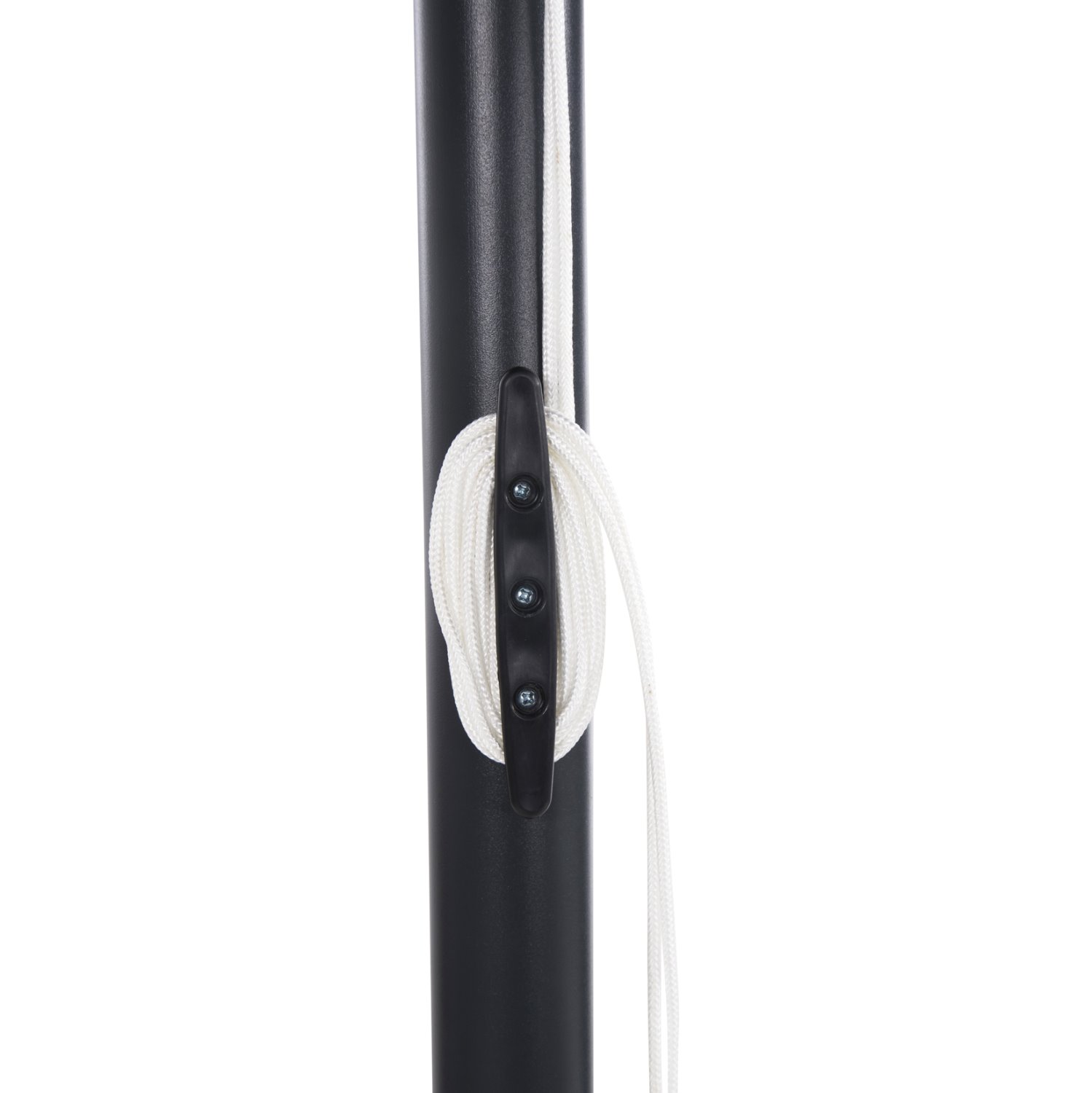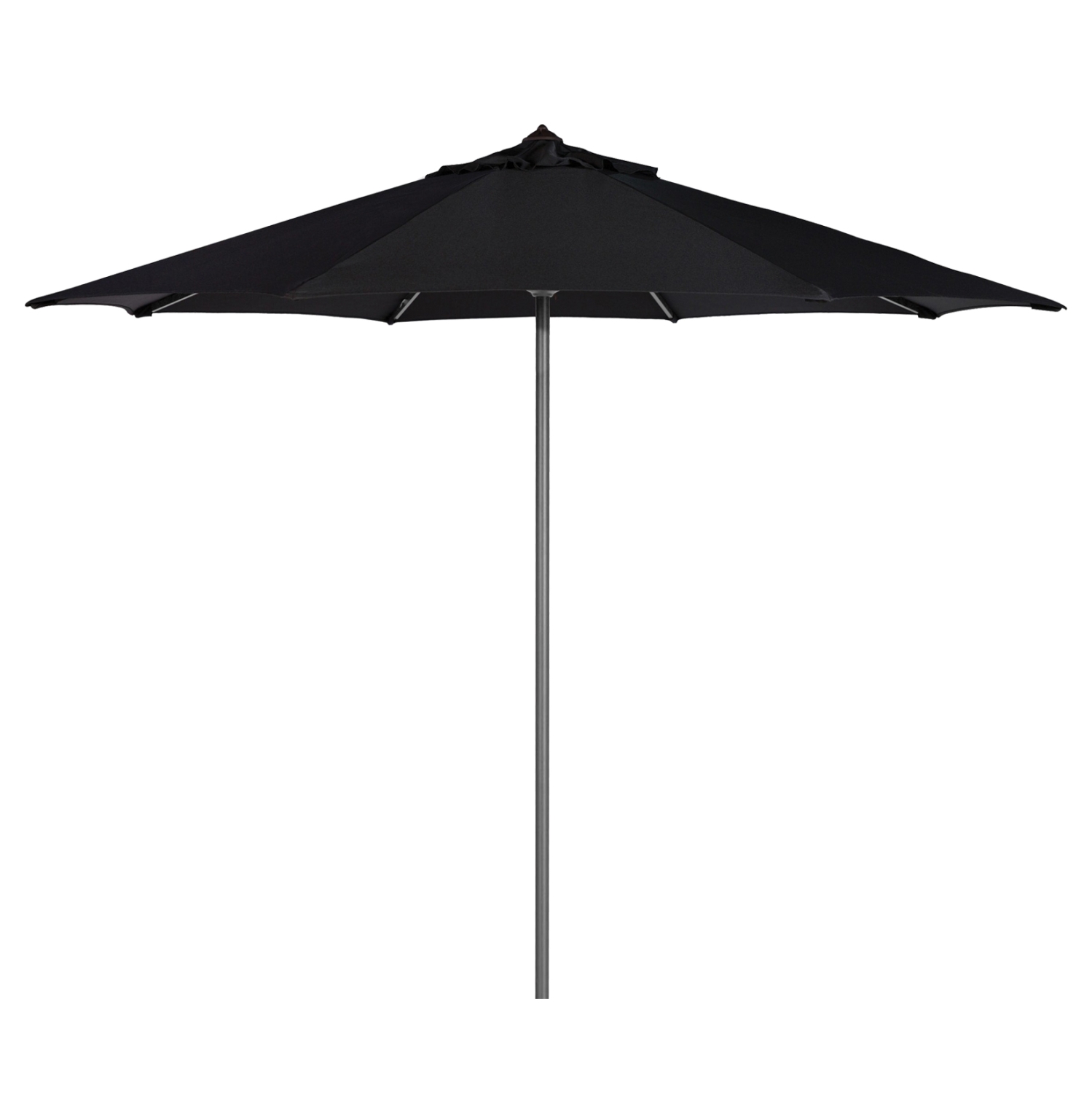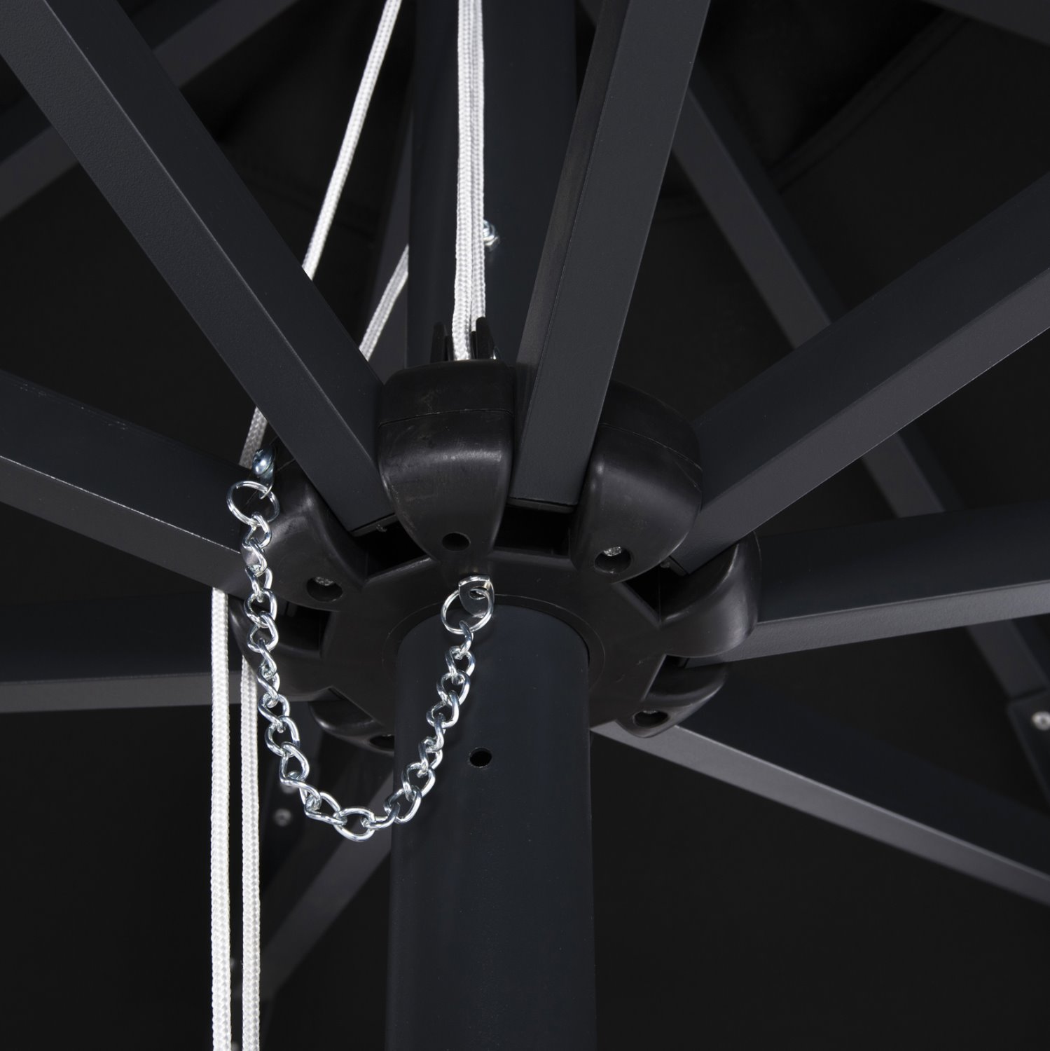 Професионален плажен чадър с кръгла форма и в черен цвят, изработен от здрава алуминиева конструкция с едноделна централна тръба и осем стабилни алуминиеви ребра. Покритието е от висококачествен акрилен плат с плътна текстура, който осигурява надеждна защита и дълготрайна употреба.