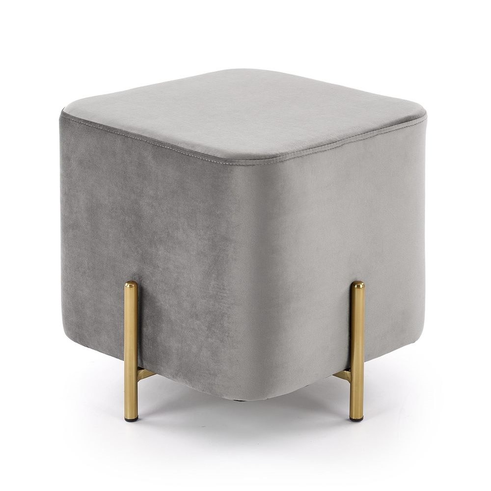 Стилна плюшена сива табуретка във формата на куб с метални златни крачета.