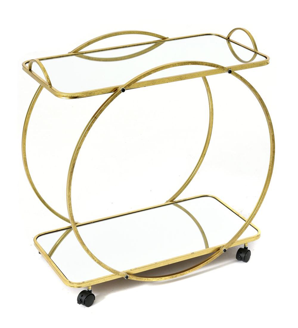 Подвижна конзолна маса, изработена от метална конструкция с интересна кръгла форма в златисто и два правоъгълни огледални плота.