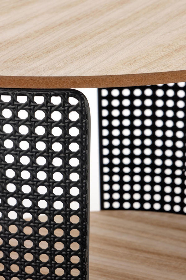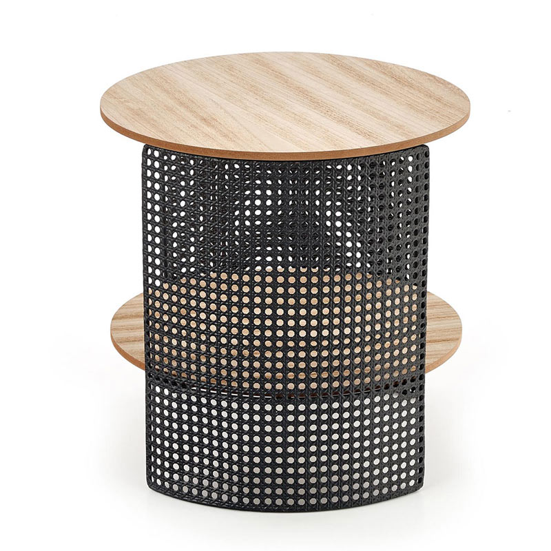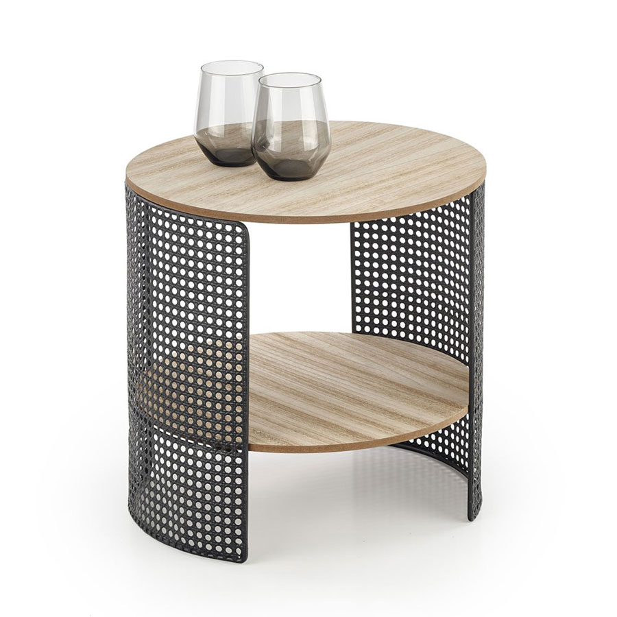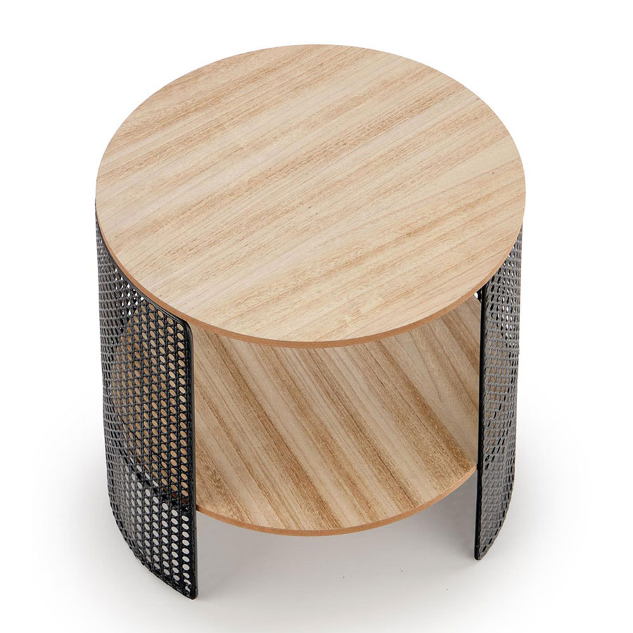 Помощна маса с два кръгли плота от МДФ в натурален дървесен цвят с извита решетъчна основа от черен метал.