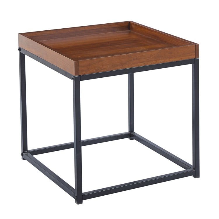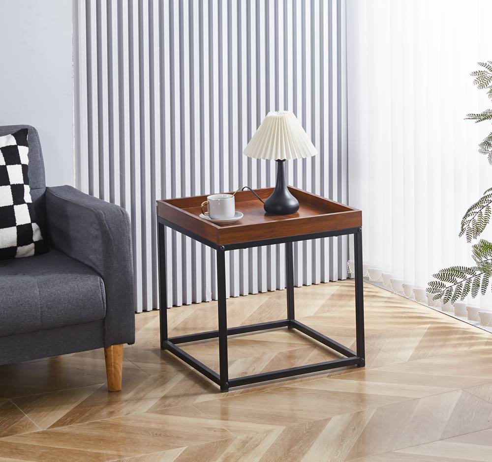 Помощна маса със семпла и изчистена визия, изработена с метална конструкция в черно и квадратен плот от 15 мм МДФ плоскост с меламин в цвят орех.