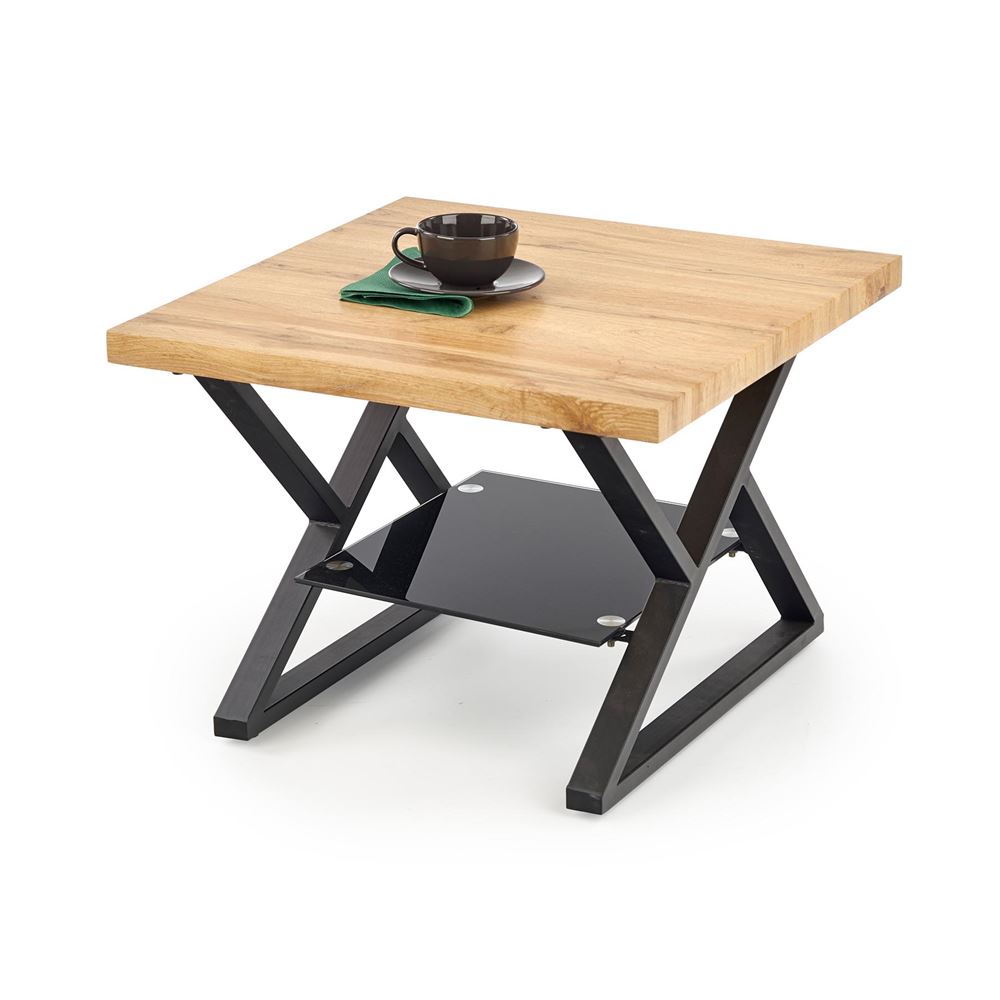 Красива помощна масичка от дърво, стъкло и метал с два плота и интересна конструкция на основата.