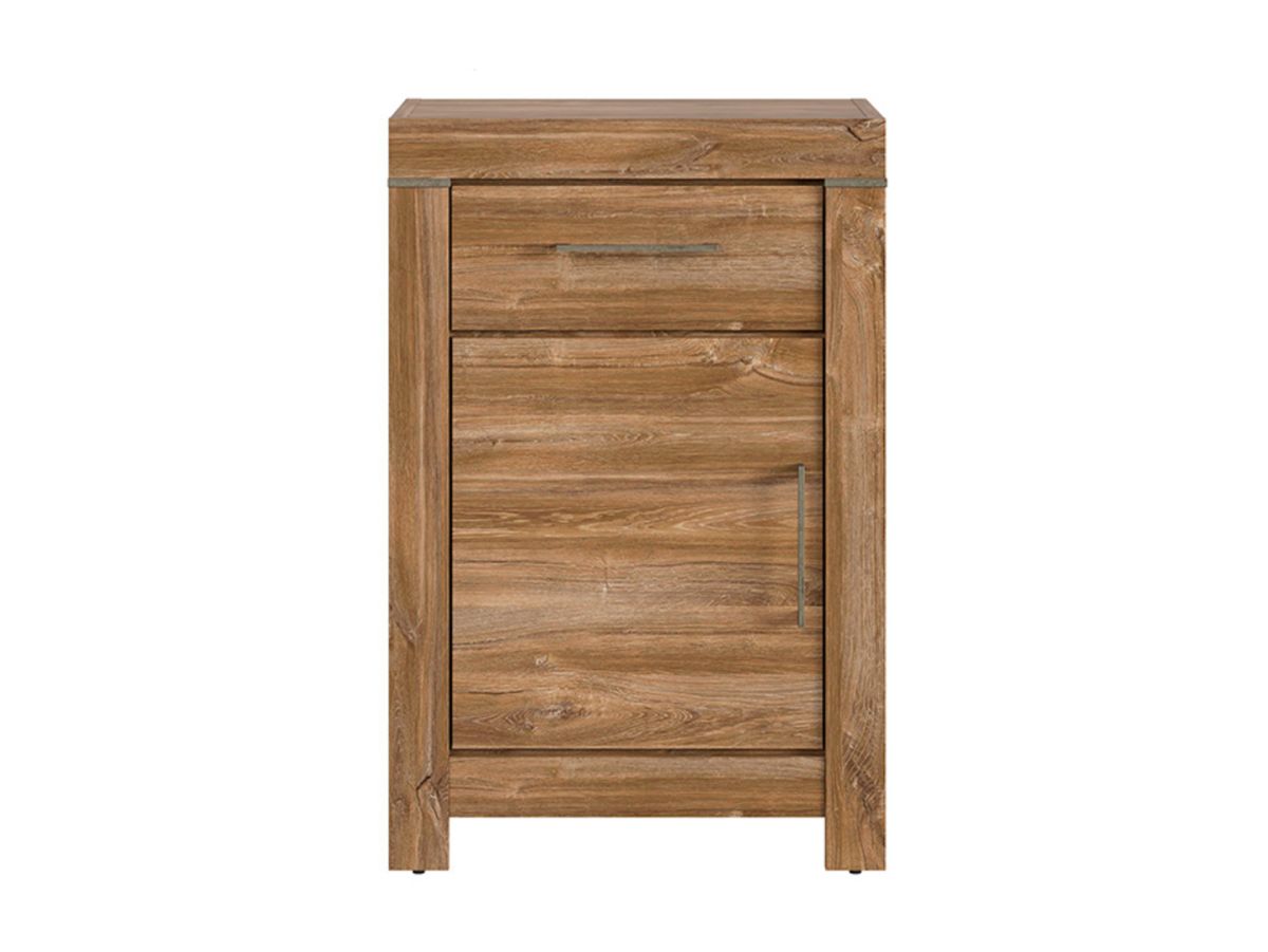 BRW предлага разнообразие от модулни системи за цялостно обзавеждане на дневна, трапезария, спалня и детска стая. Продуктовата гама включва легла, гардероби, шкафове, скринове, комоди, маси, столове, ТВ поставки, етажерки, витрини, бюра, тоалетки, портманта, закачалки, огледала и други. Корпусните мебели са решени в атрактивни дървесни нюанси или с покритие от бял гланц или мат.Висок шкаф за антре в дървесен цвят Гент