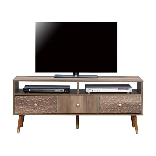Практичен ТВ шкаф, разполагащ с два рафта и три чекмеджета с интересна визия и с достатъчно място за декорация и съхранение на любими вещи, серия Шани.