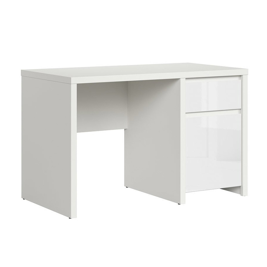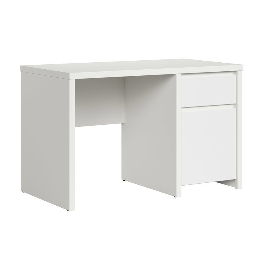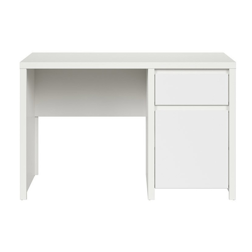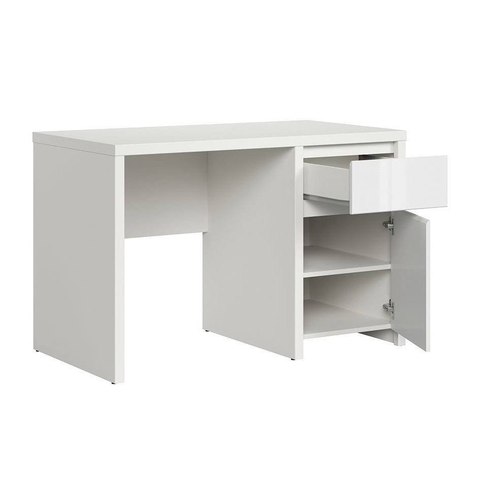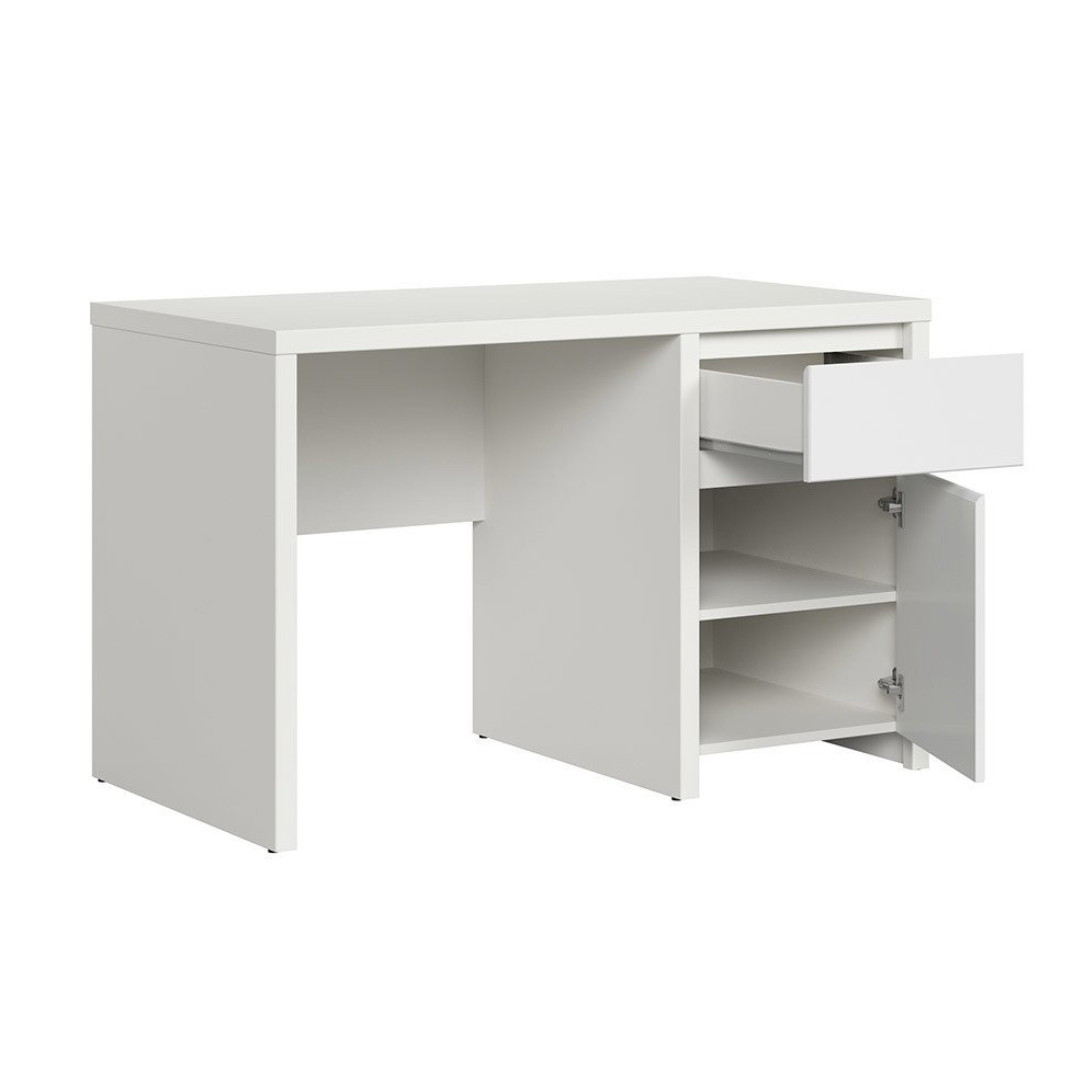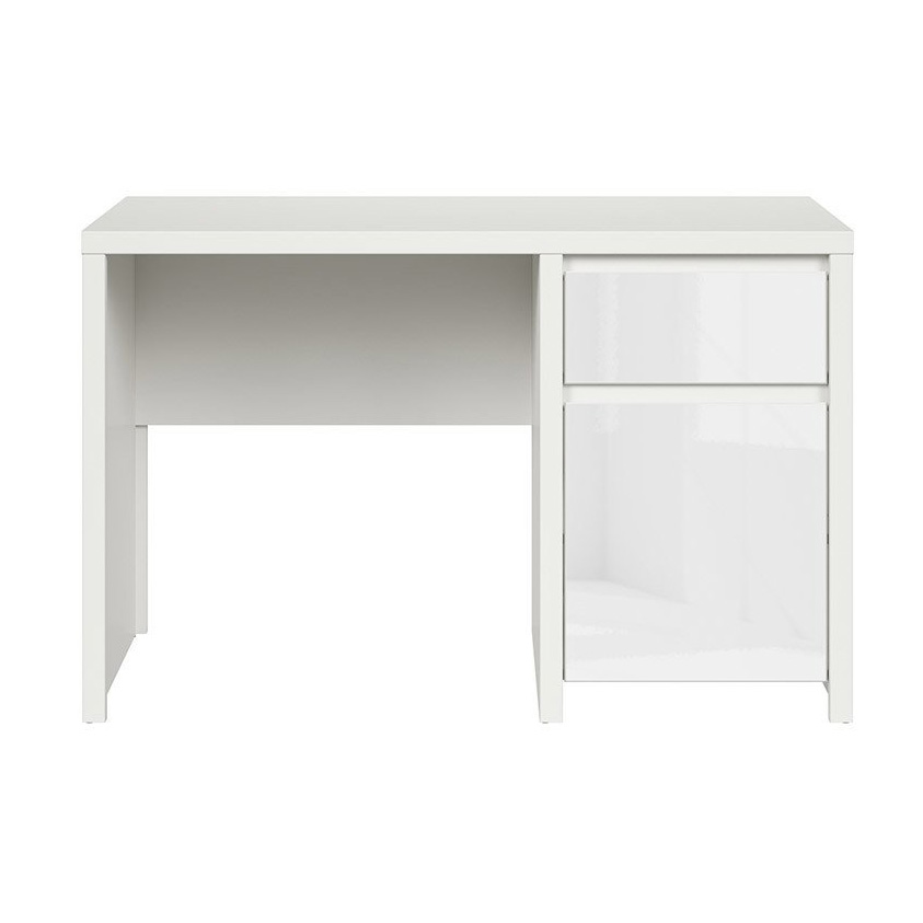 Практично работно бюро от ПДЧ в бяло с чекмедже и вратичка в два варианта – с матирана или гланцирана повърхност, модулна система Каспиан Бял.