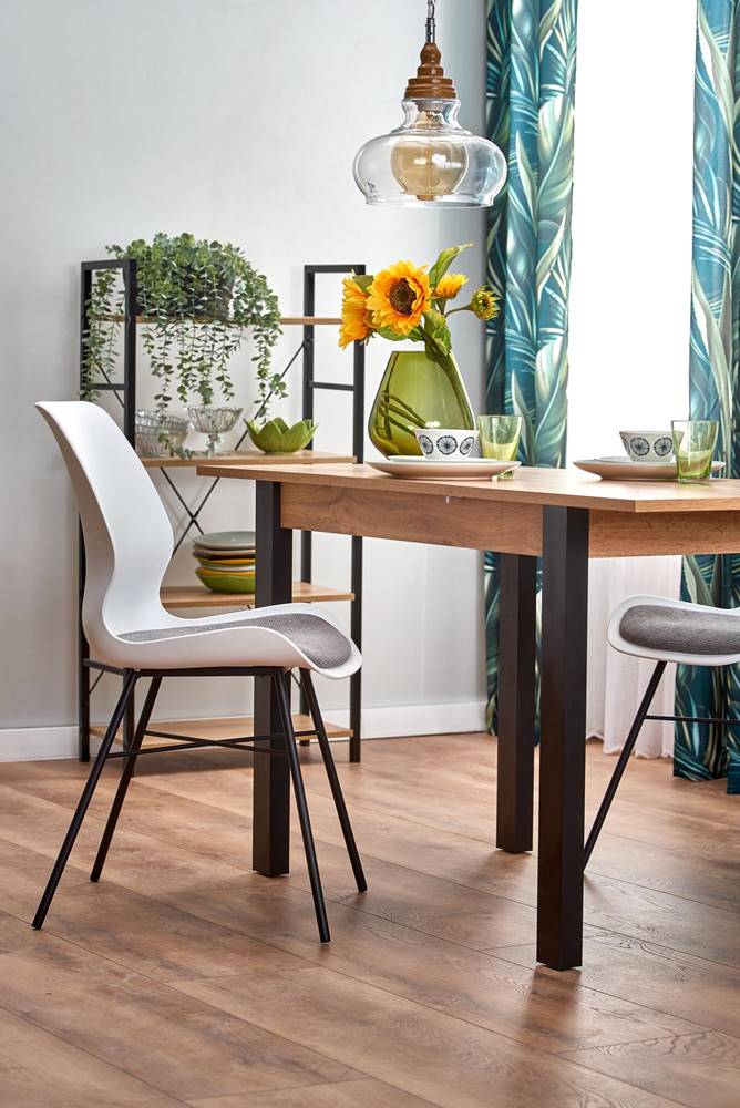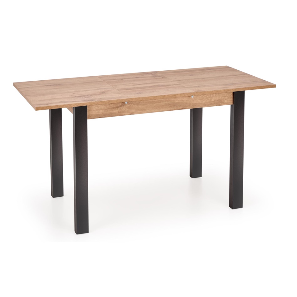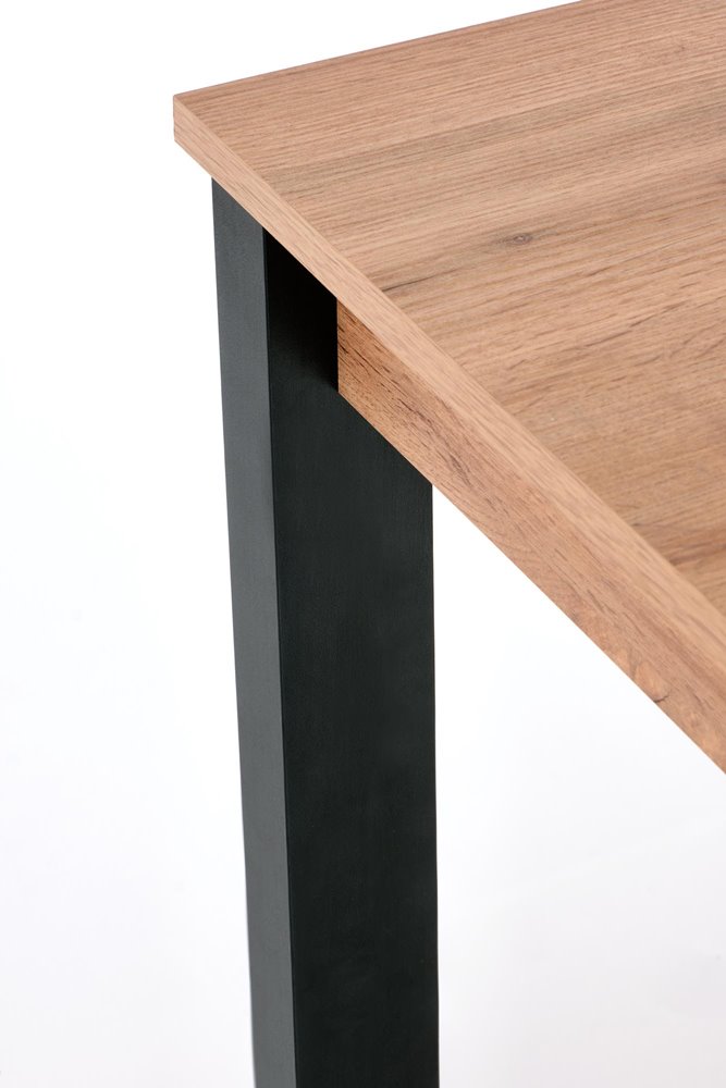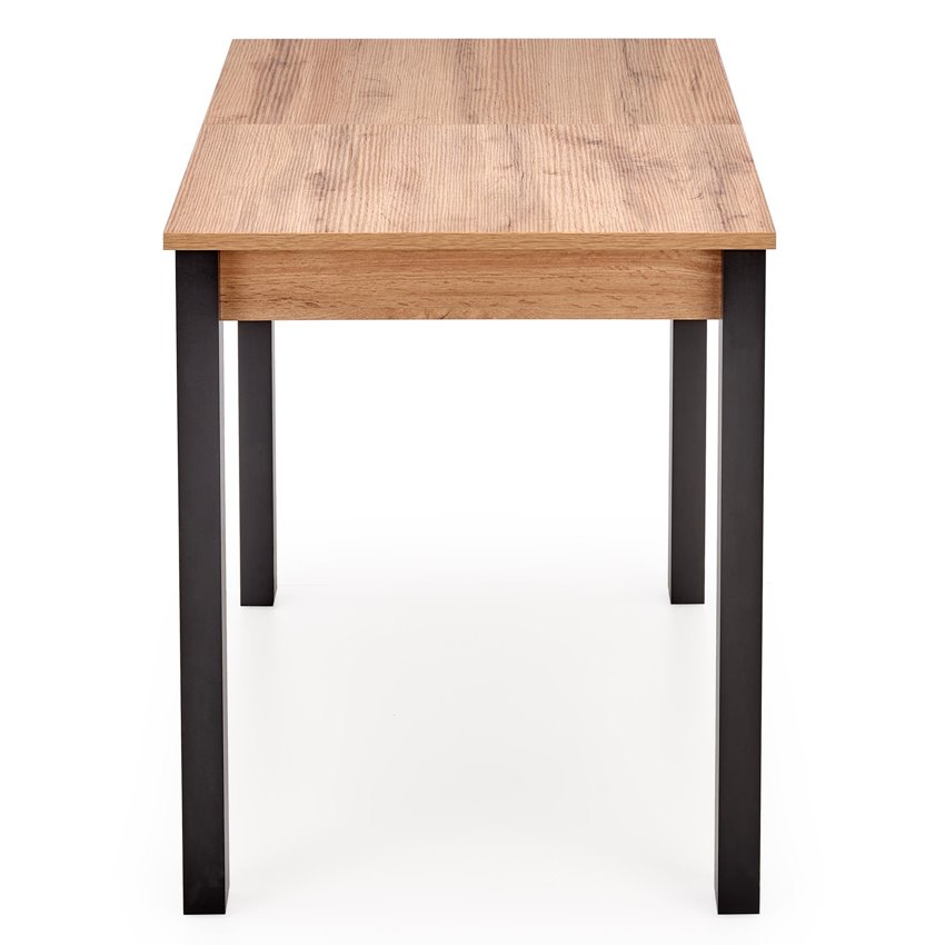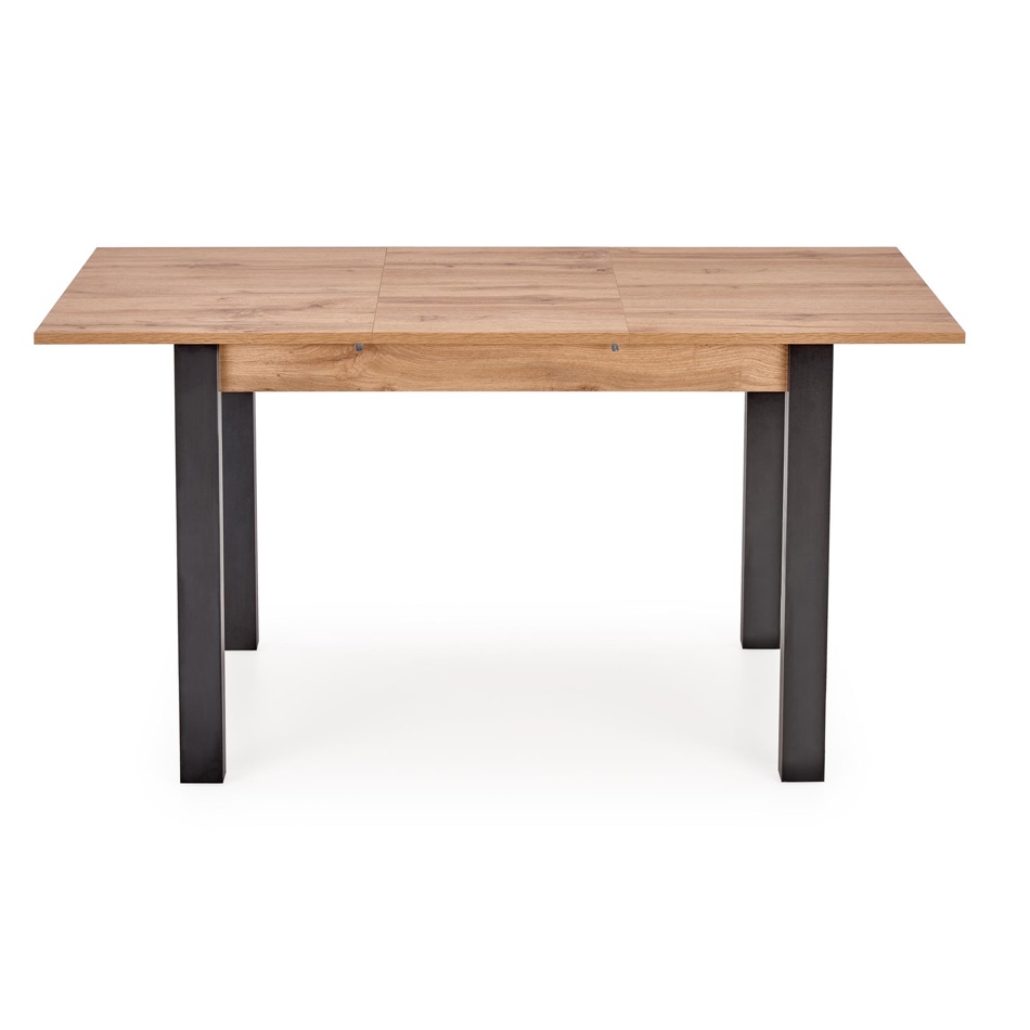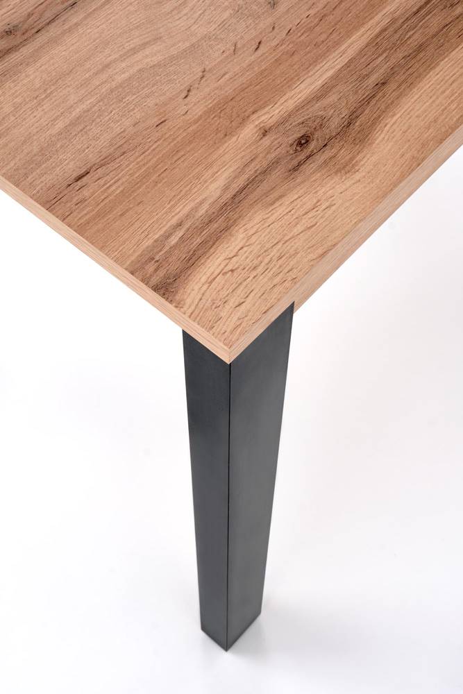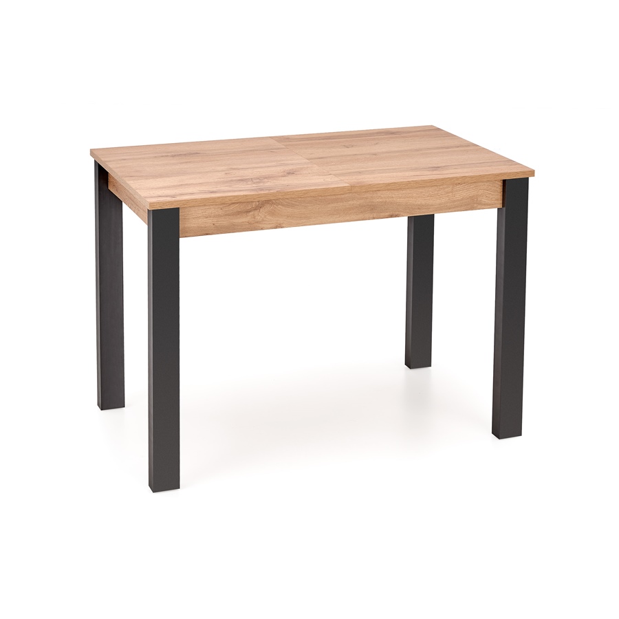 Правоъгълна разтегателна маса, изработена с плот в дървесен цвят и крака в черно.
