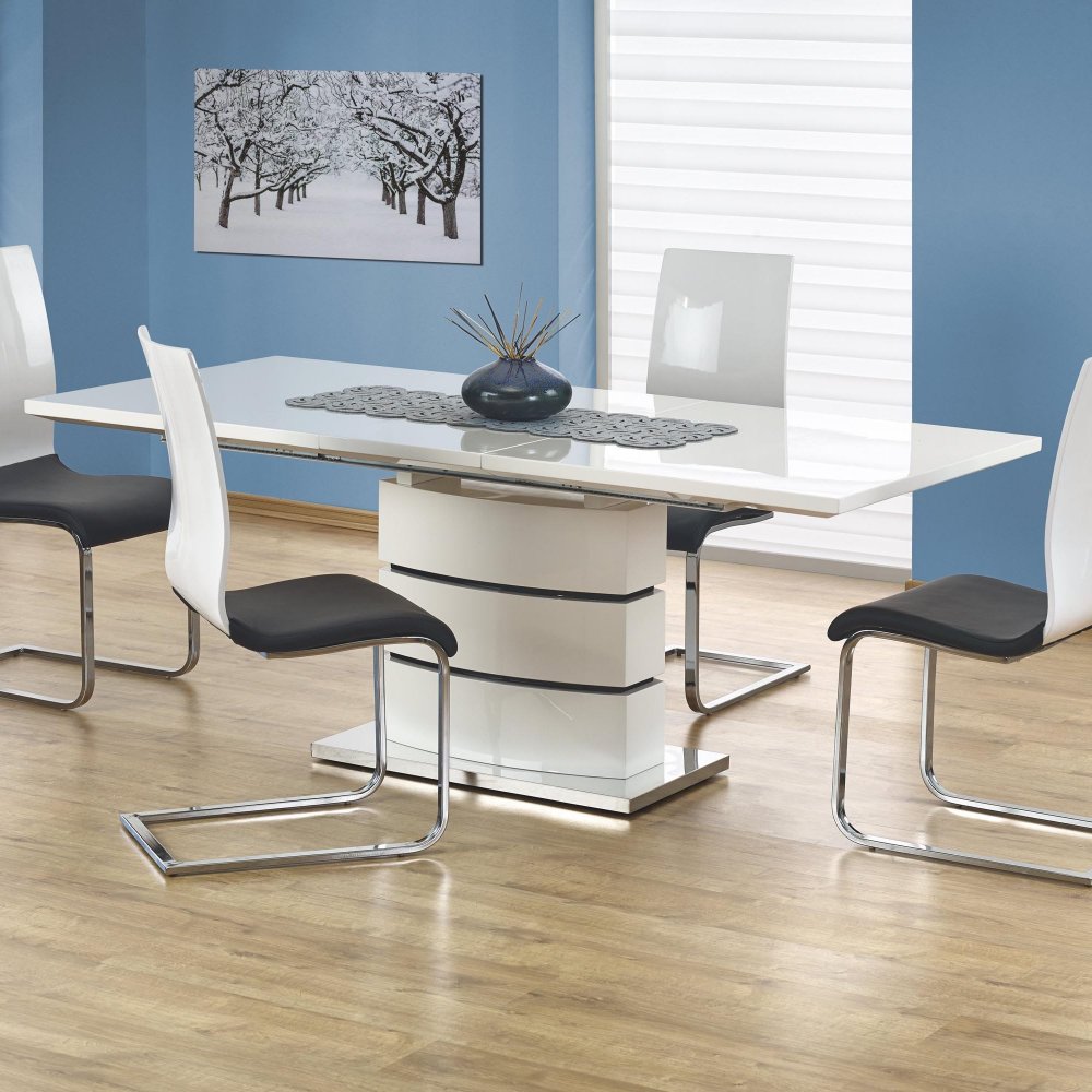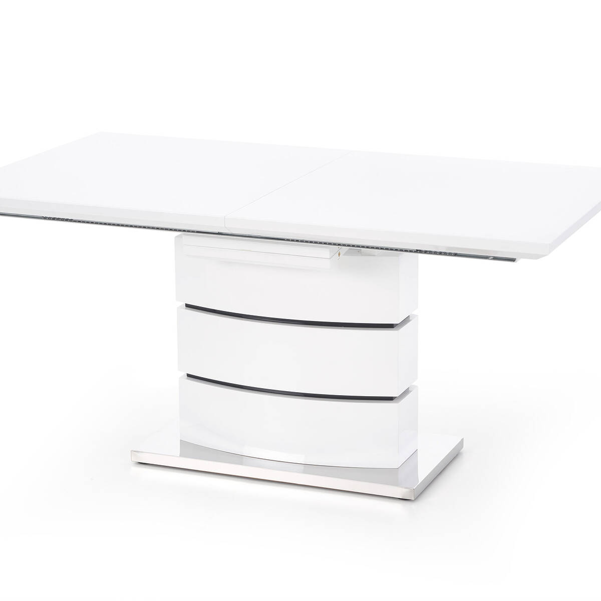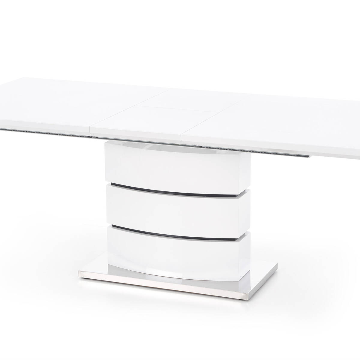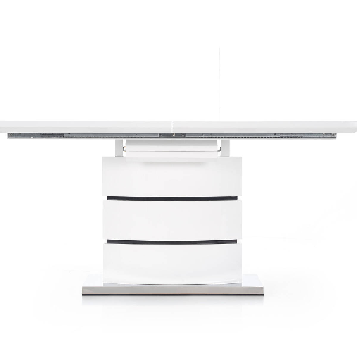 Правоъгълна трапезна маса с опция за разтягане Стил. Комбинация от бял лакиран МДФ и стомана.