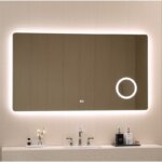 Правоъгълно LED огледало с награветел за баня и допълнителни функции като тъч скрийн, възможност за контрол на светлината и увеличително козметично огледало.