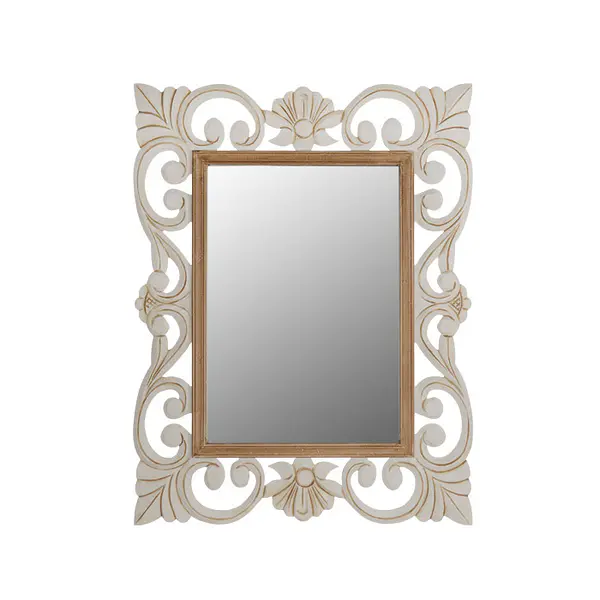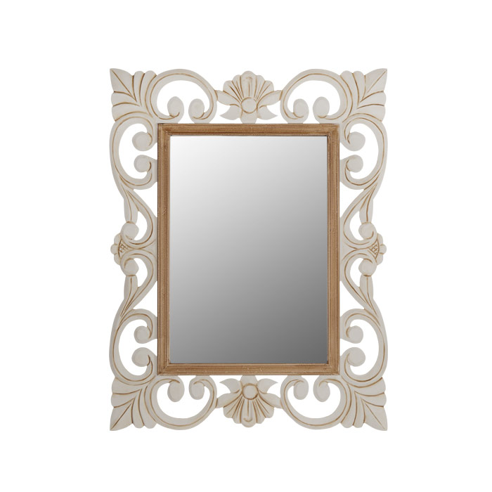 Правоъгълно стенно огледало с дървена рамка с пищна декорация в цвят екрю, серия Мелани.