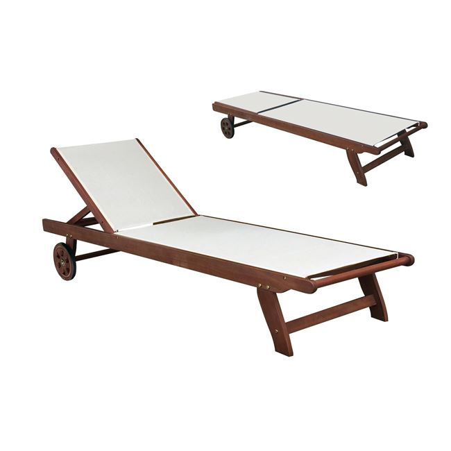 Професионален дървен шезлонг с колелца, изработен от акация в цвят орех и текстиленова мрежа в нюанс екрю. Регулируемата облегалка в 4 позиции и мобилността на този модел допринася за допълнителен комфорт и удобство.