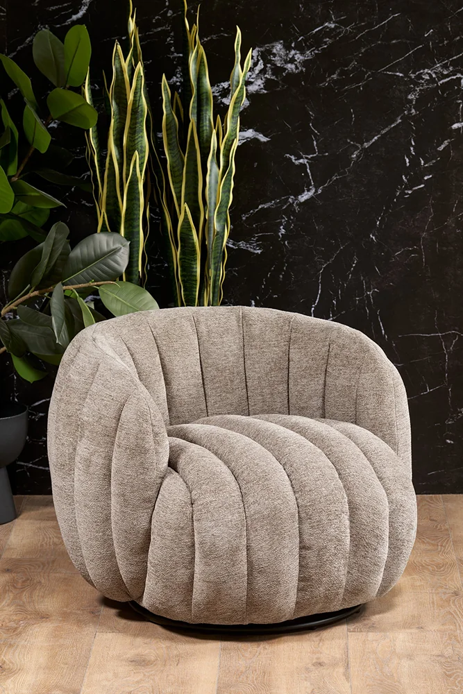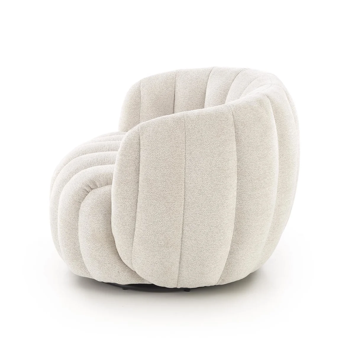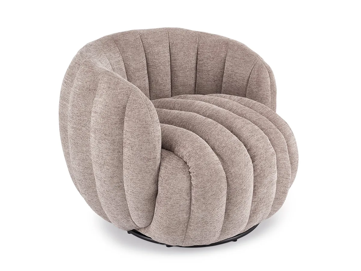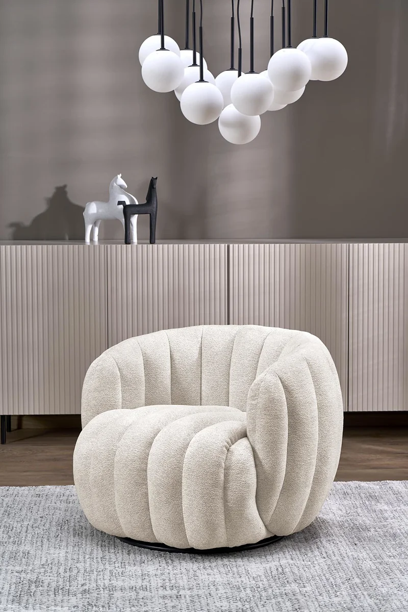 Изработен е от мек текстил в кремав и тъмнобежов цвят и основа от праховобоядисана стомана, предлага уют и стил във всяко пространство.