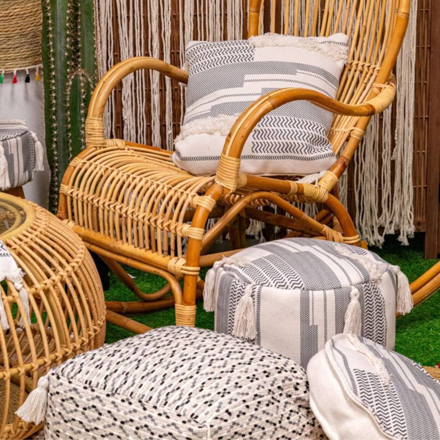 Компактната форма позволява да се използва като табуретка, поставка за крака или малка помощна масичка. Декоративните пискюли придават усещане за ръчна изработка и добавят чар към модерния дизайн.