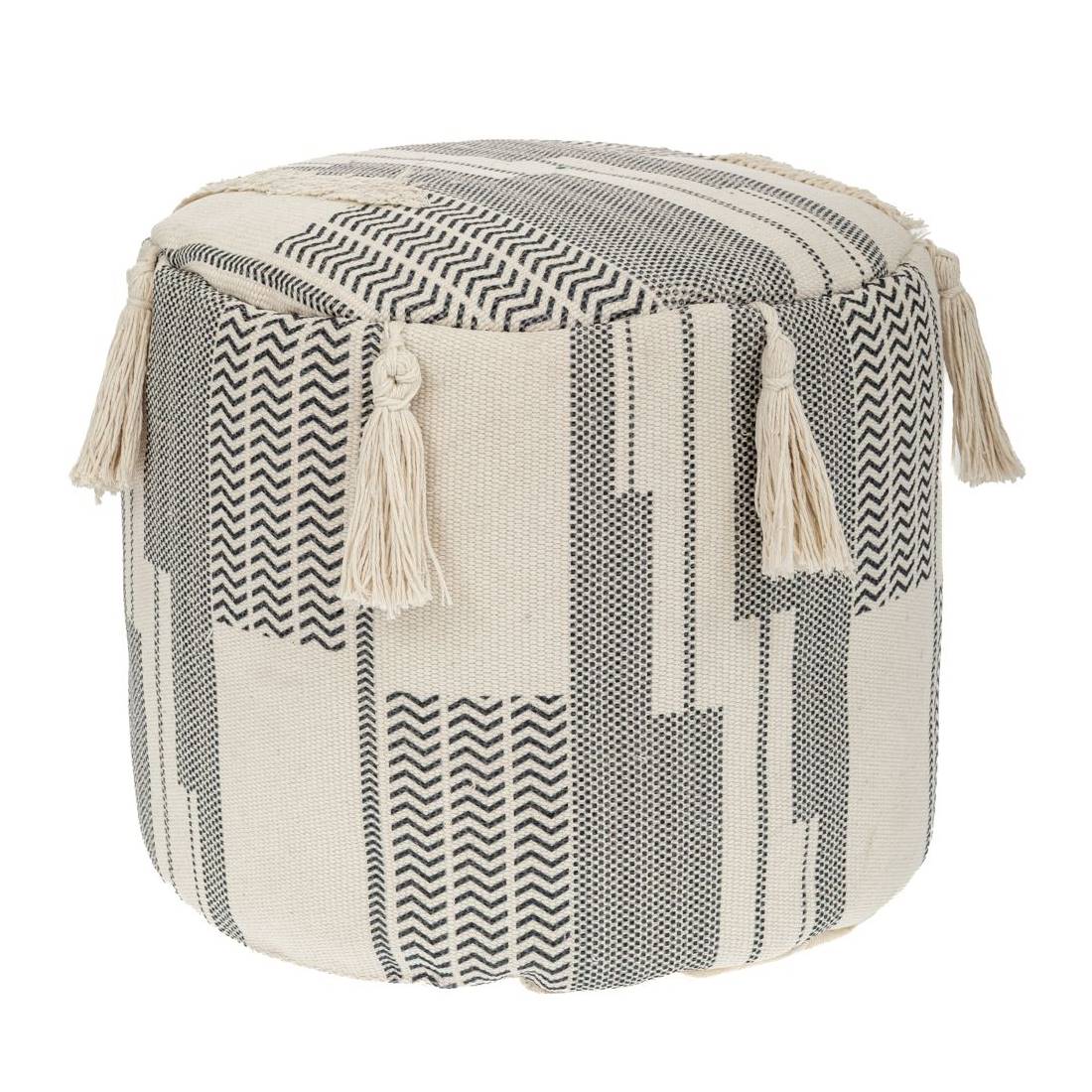 Този стилен пуф в мек екрю цвят с черни геометрични шарки е универсално допълнение към всеки интериор. Изработен от качествен поликотън плат, той съчетава практичност и елегантна визия.