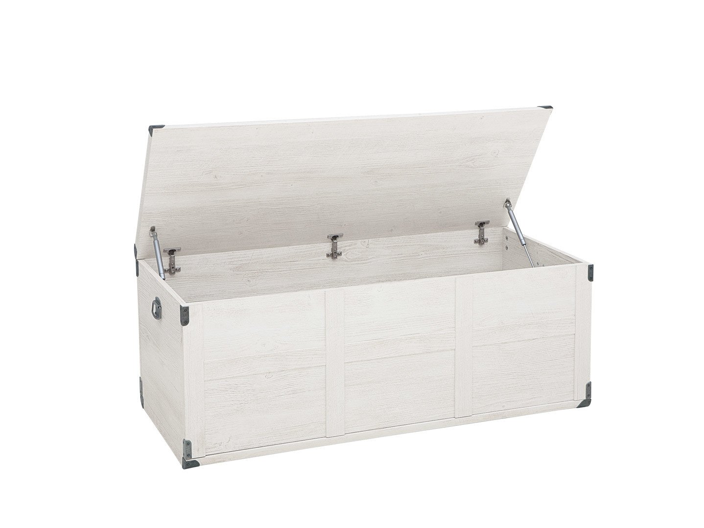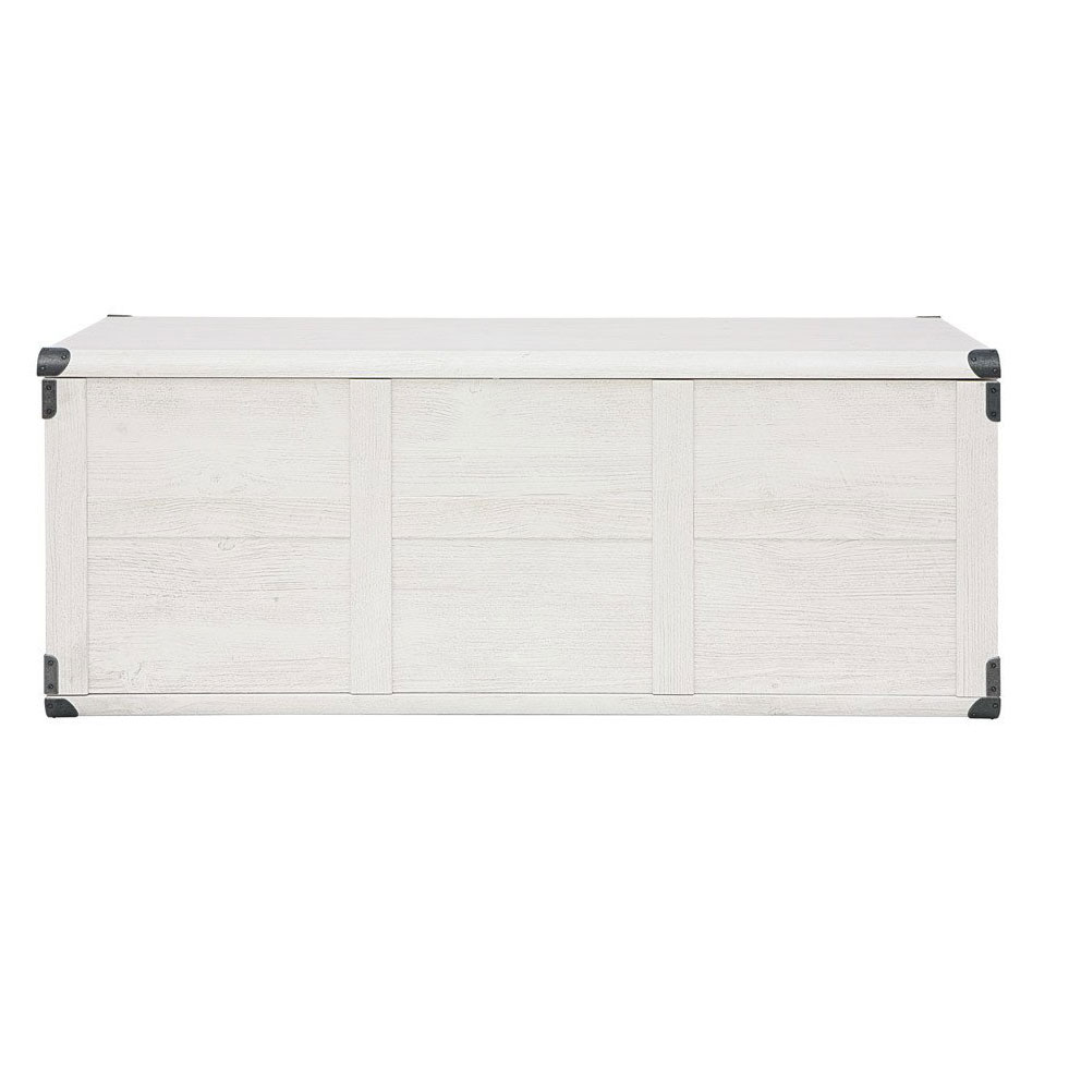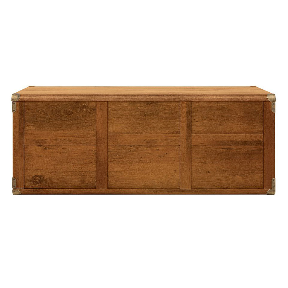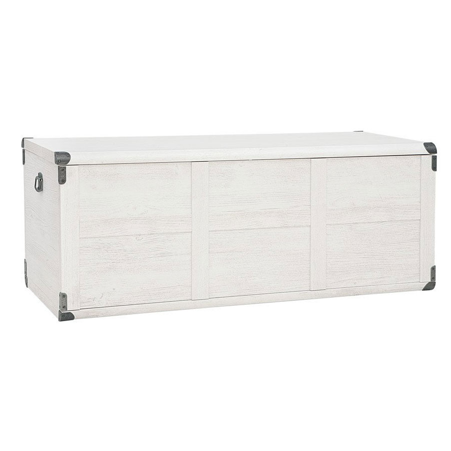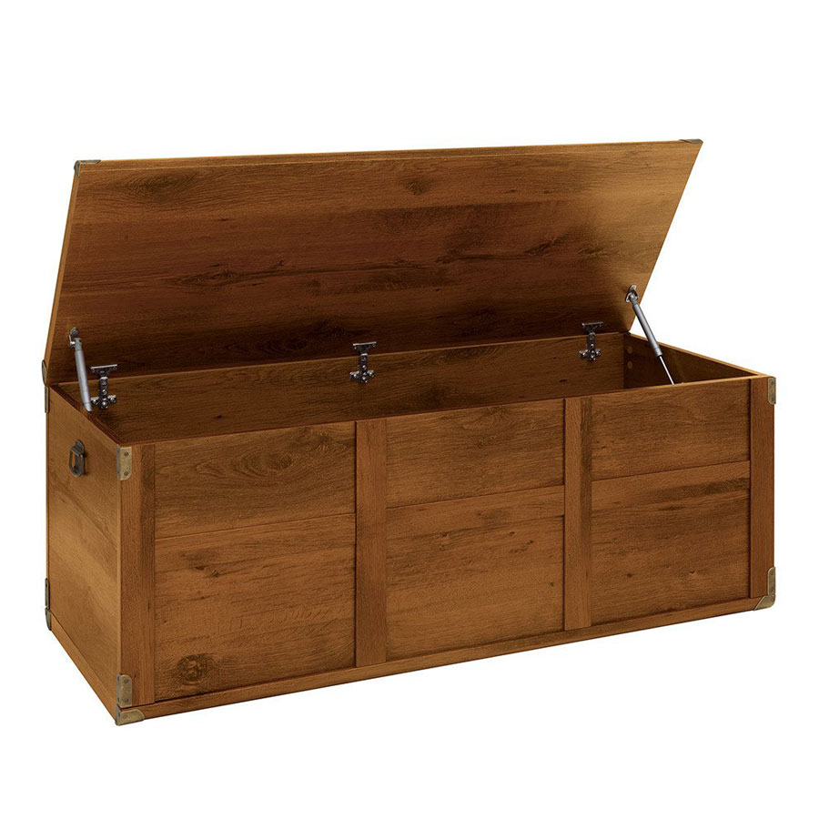 Ракла като сандък с рамкирани страни, облицовани метални ъгли и старинни дръжки за лесно пренасяне, модулна система Индиана. Предлага се в два дървесни цвята – дъб сутер и бор каньон.