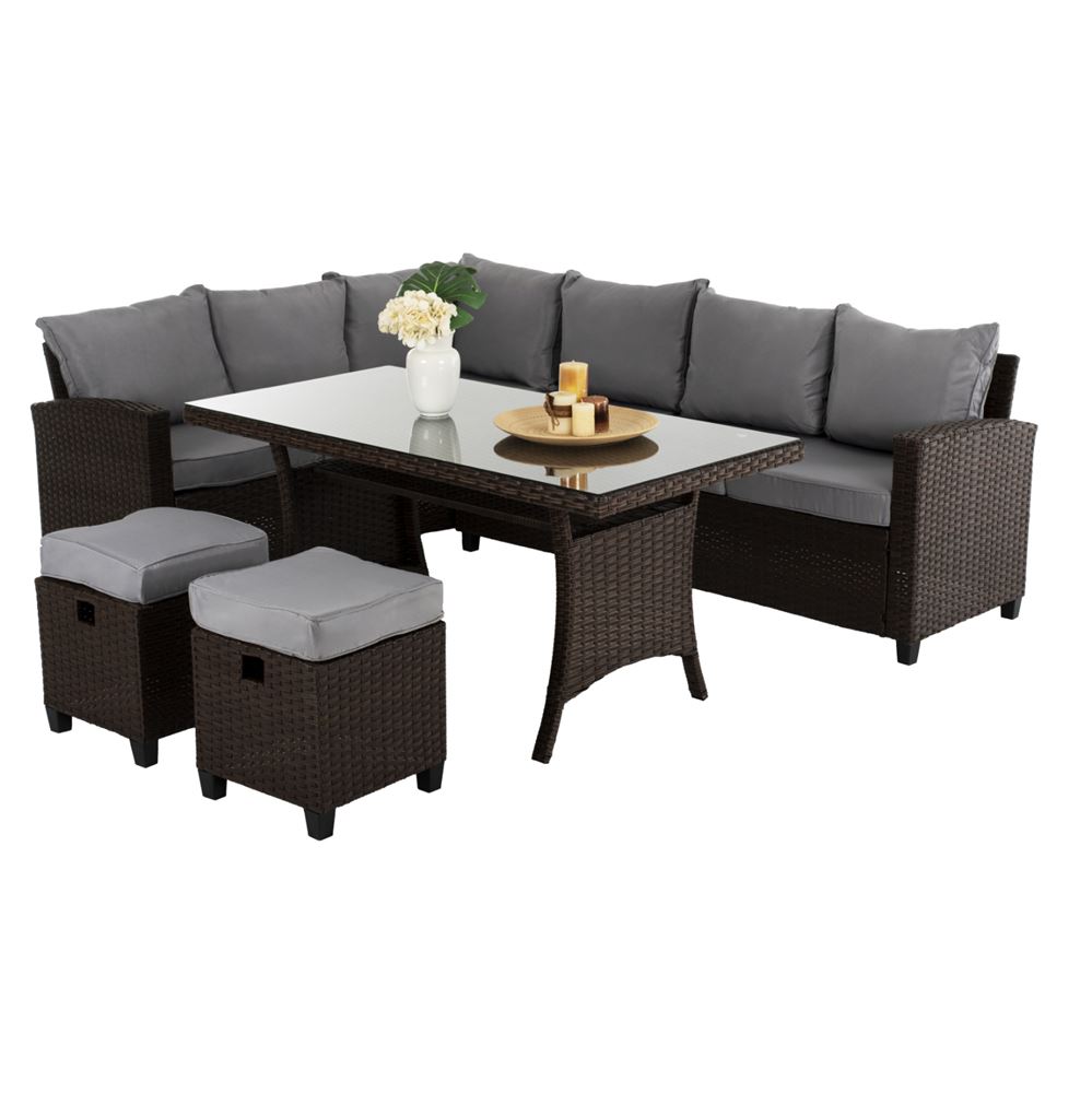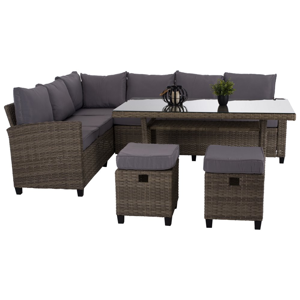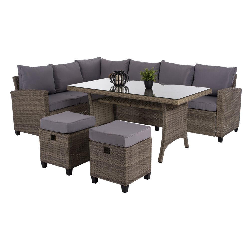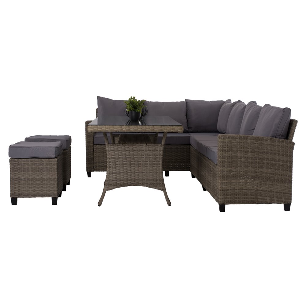 Ратанов градински сет, състоящ се от пет части – ъглов диван (две части), 2 табуретки и маса с плот от закалено стъкло, изработени от синтетичен ратан с оплетка, серия Nicea.