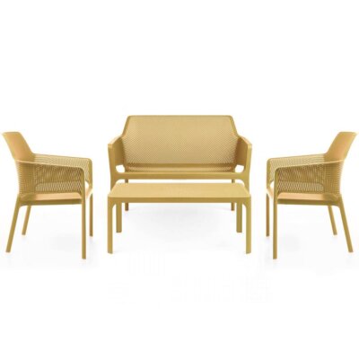 Ратанов сет от четири части, състоящ се от канапе и две кресла от синтетичен ратан в натурален цвят с възглавнички в екрю и правоъгълна маса със стъклен плот върху черна метална основа, серия Мейсън.