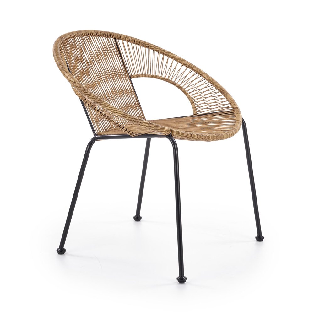 Ратанов стол за градина с подлакътници и черна метална основа.