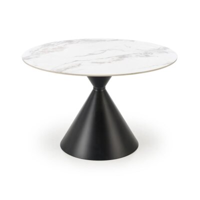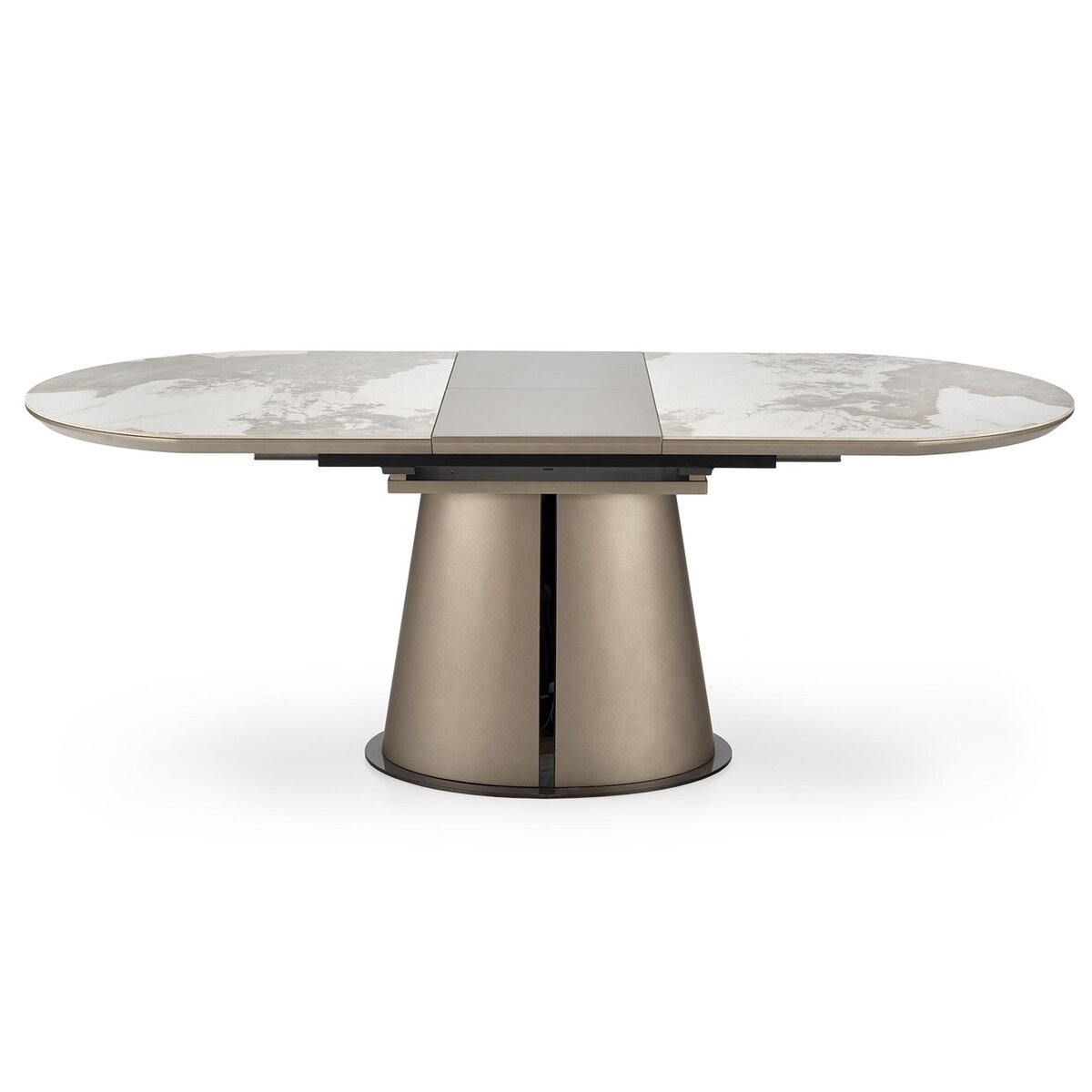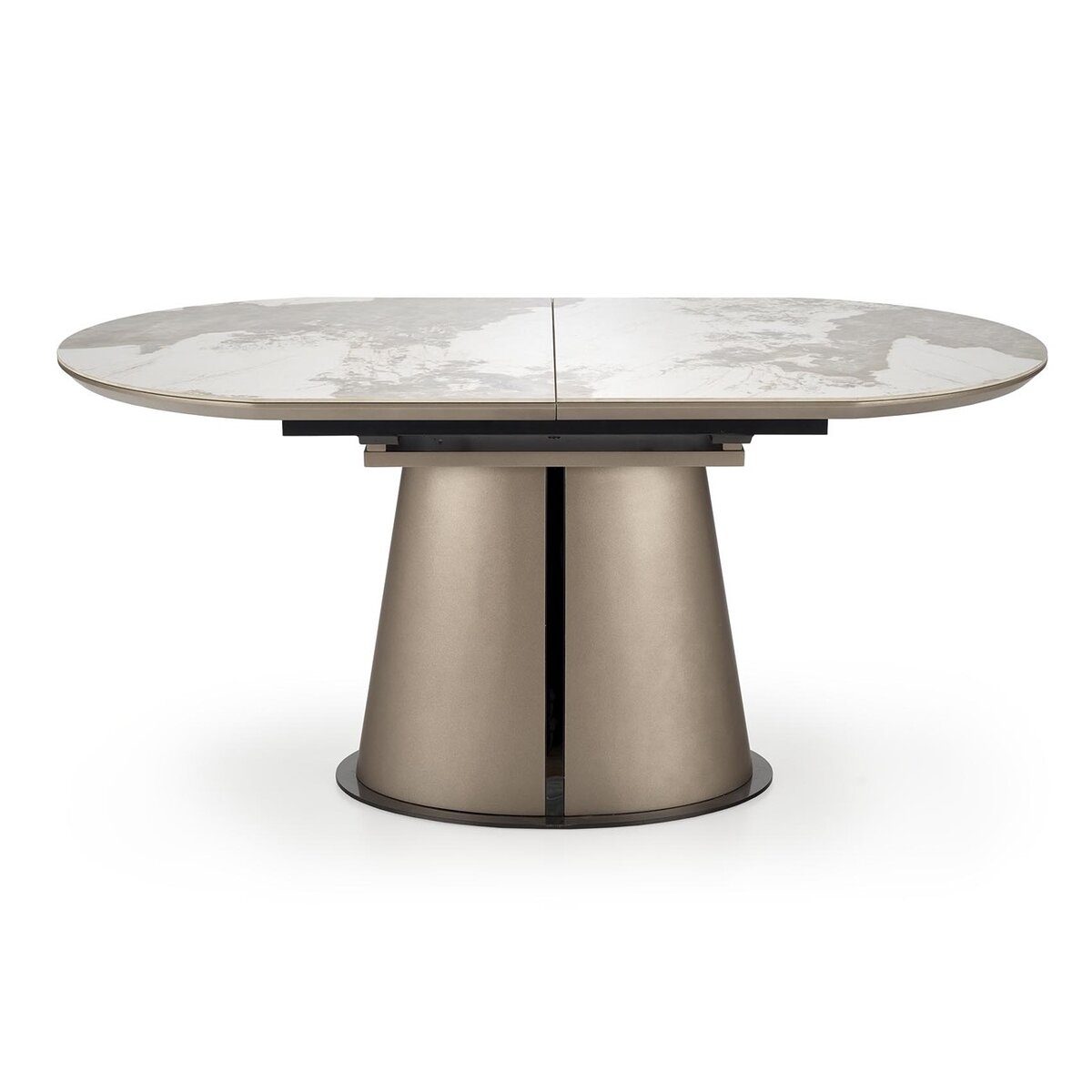 Тази разтегателна трапезна маса имитираща бежов мрамор Ромио е изработена с плот от МДФ и керамика, както и с основа от стомана.