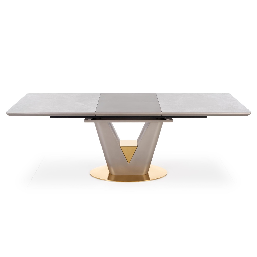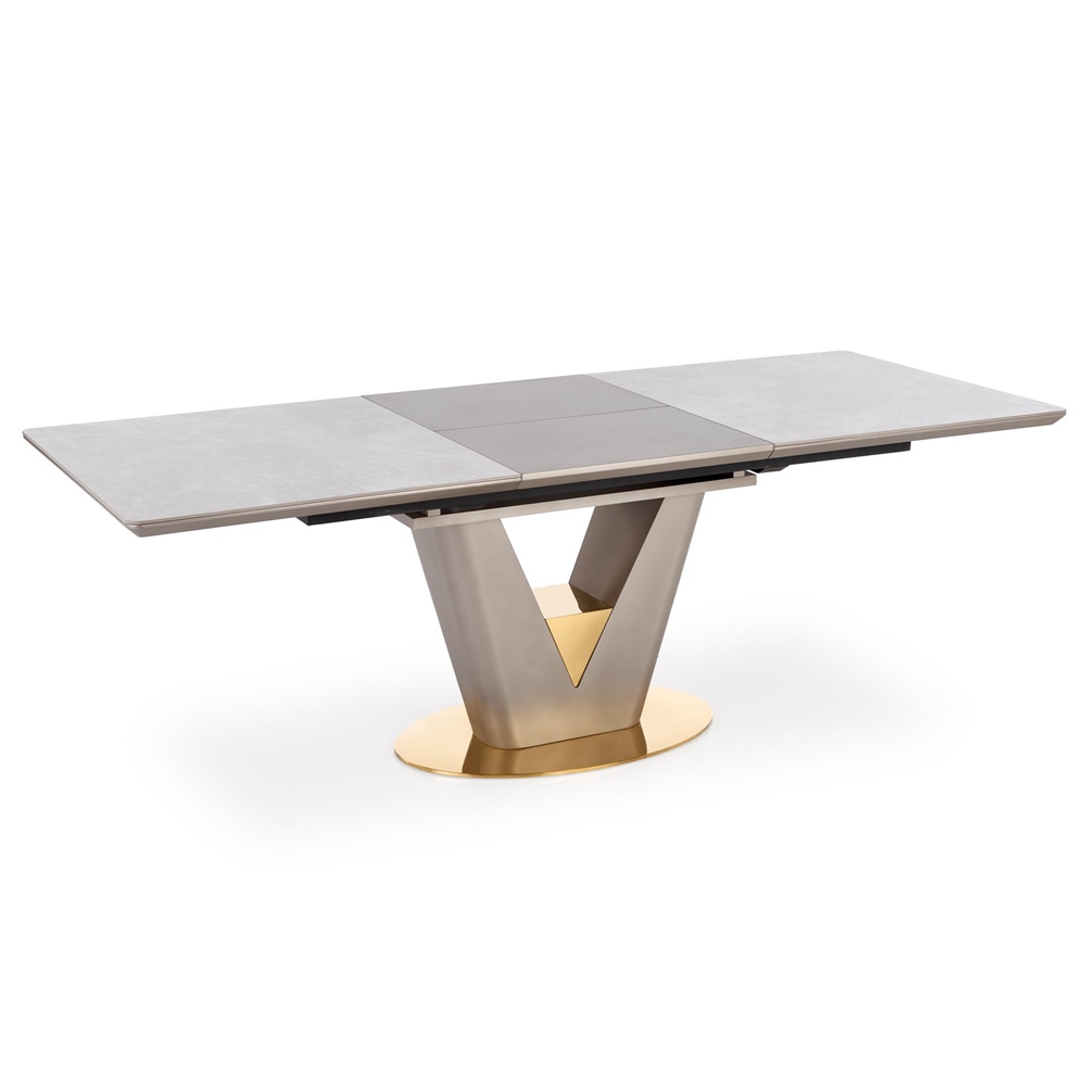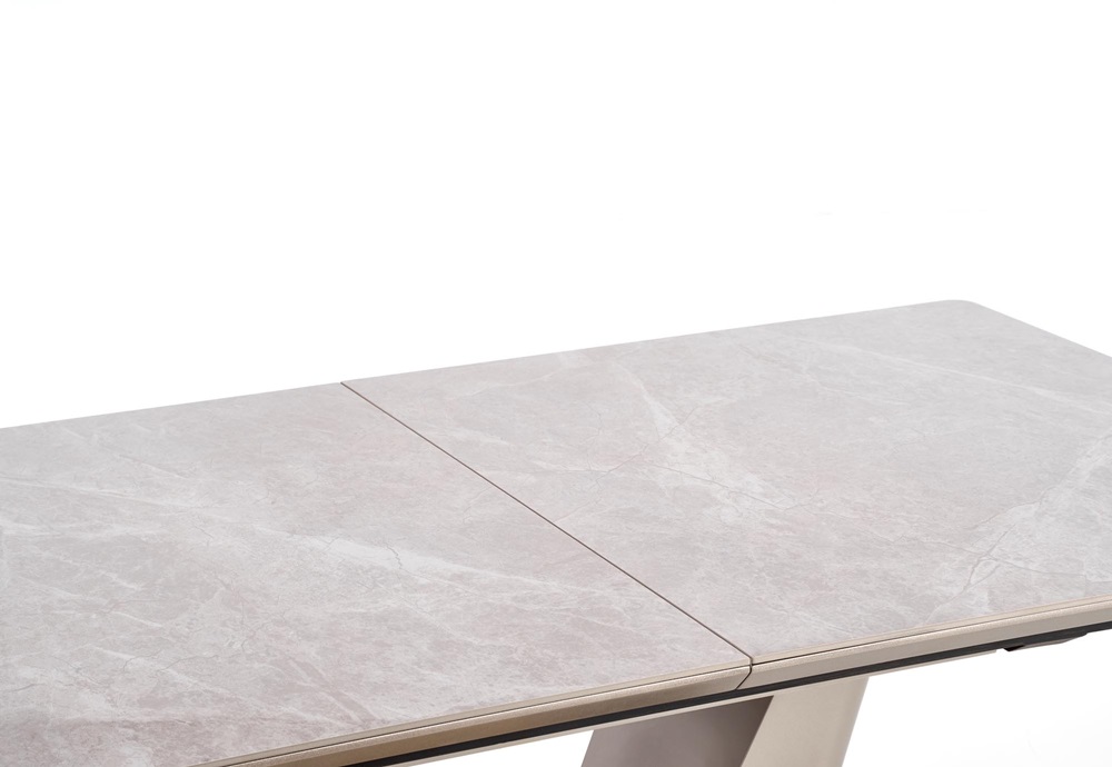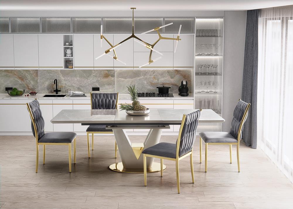 Тази модерна трапезна маса с керамичен плот и опция за разтягане до 220см е стилна мебел с впечатляващ дизайн, и е отличен избор за съвременна трапезария!