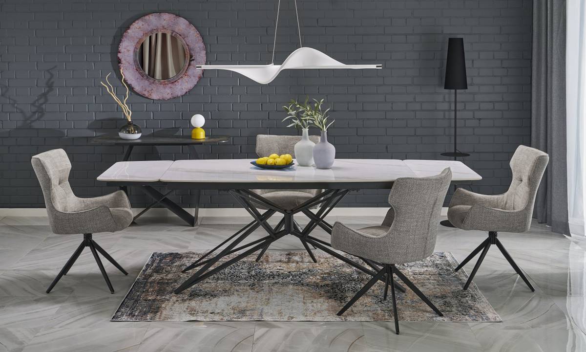 Разтегателна трапезна маса, изработена с плот от синтерован камък в цвят като бял мрамор и атрактивна метална основа, която добавя модерен акцент и стабилност.