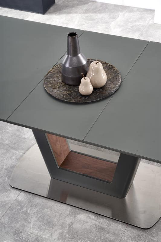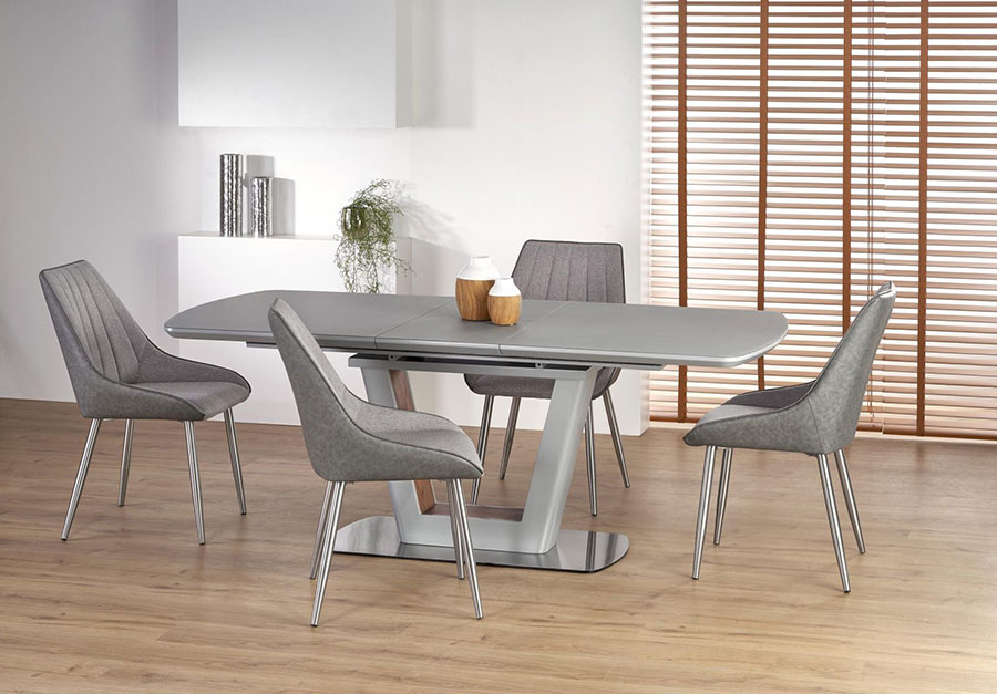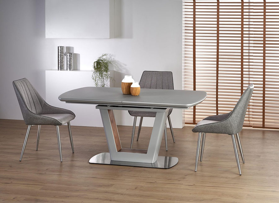 Разтегателна трапезна маса с елегантен дизайн в две цветови комбинации – антрацит с орех и светлосиво с орех.