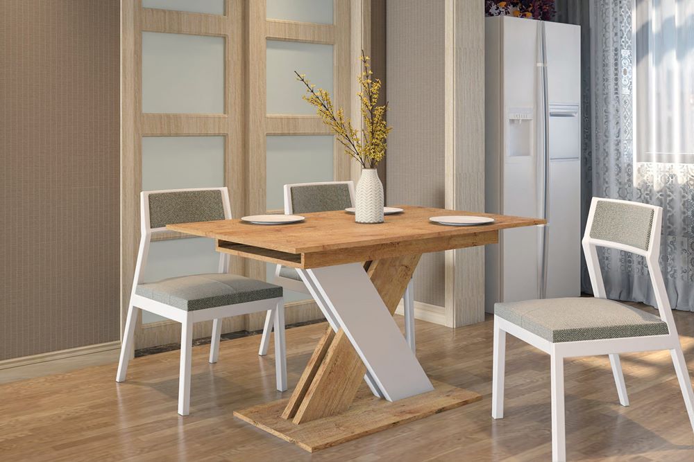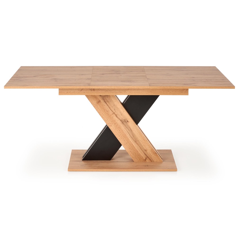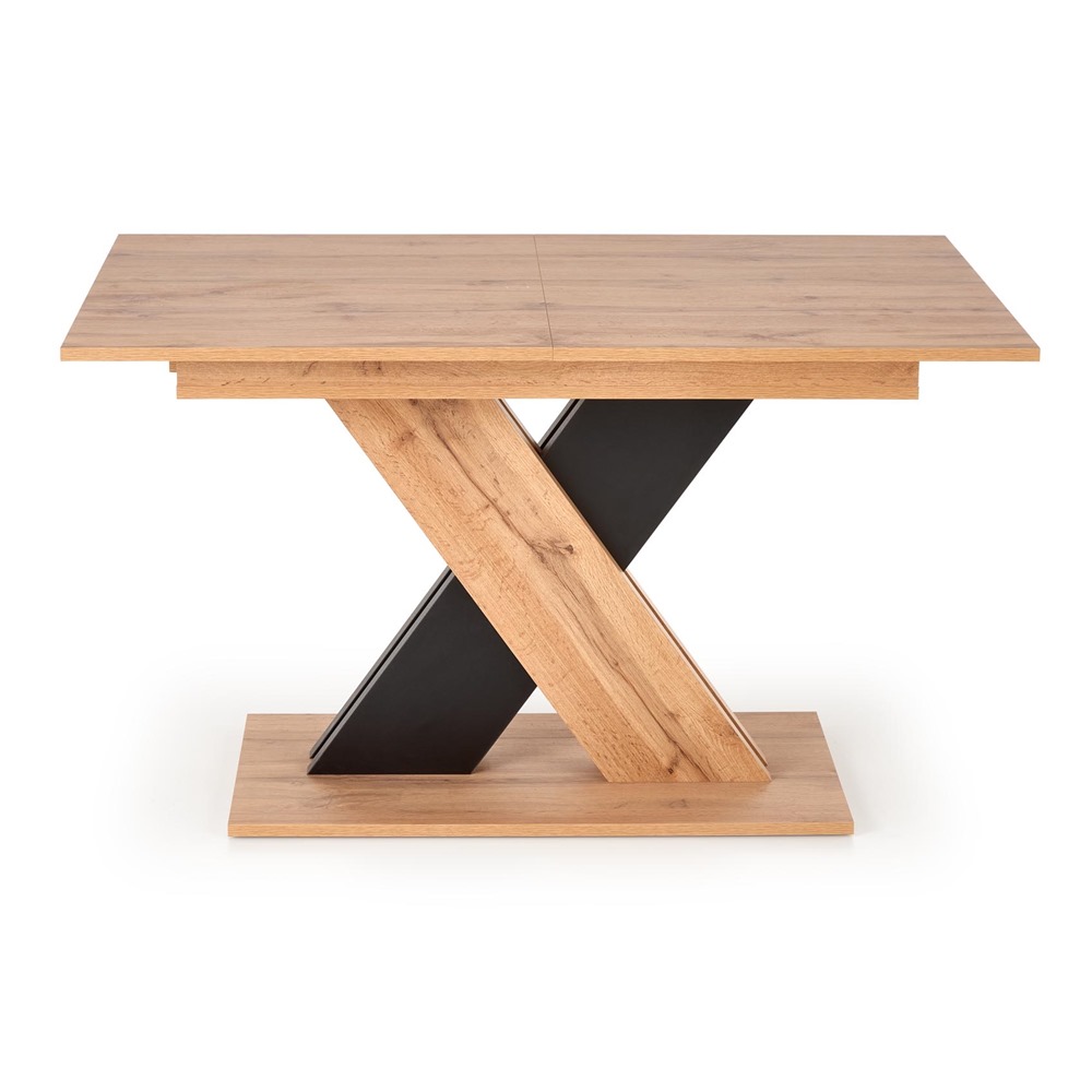 Разтегателна трапезна маса с правоъгълен плот, решена в дъб вотан с черно или дъб ланселот с бяло.