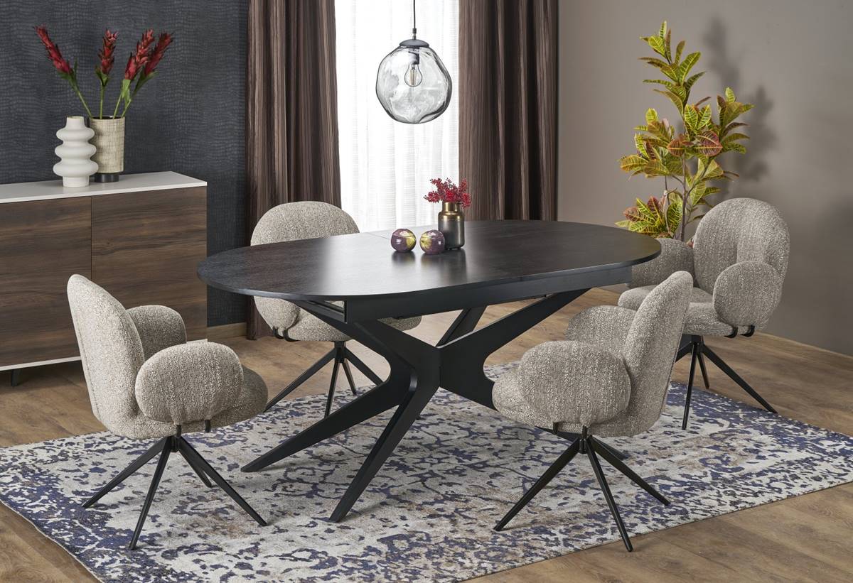 Разтегателна трапезна маса, изработена с черен фурнирован МДФ плот и дизайнерска метална основа, която придава стилен и съвременен облик, като същевременно гарантира стабилност и здравина.