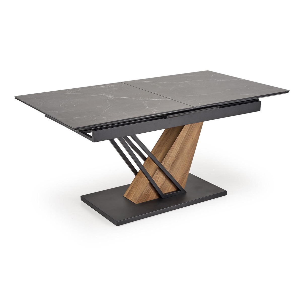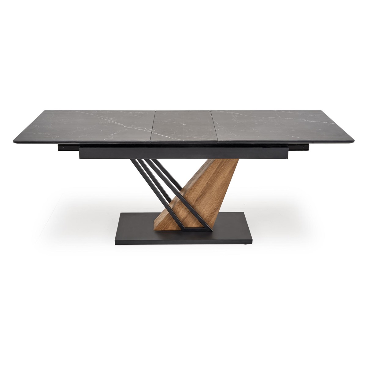 Плотът на разтегателна трапезна маса с модерен дизайн Вок е изработен от синтерован материал имитиращ черен мрамор.