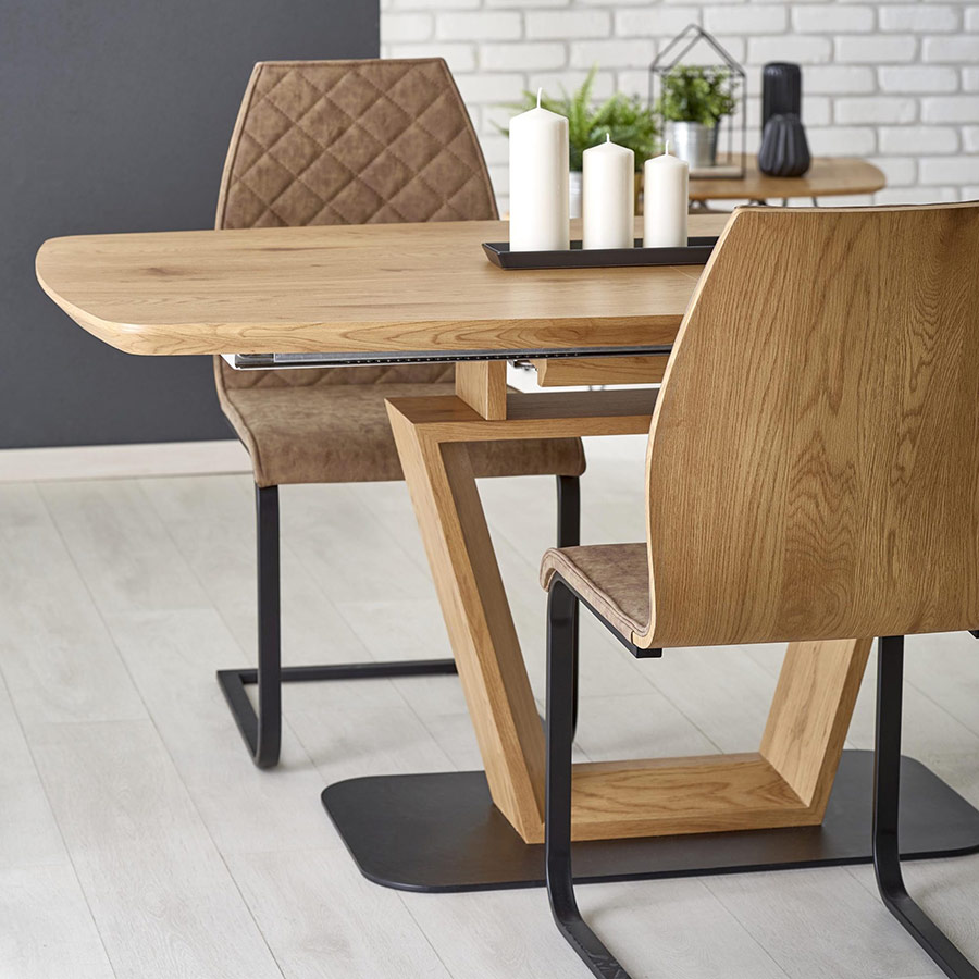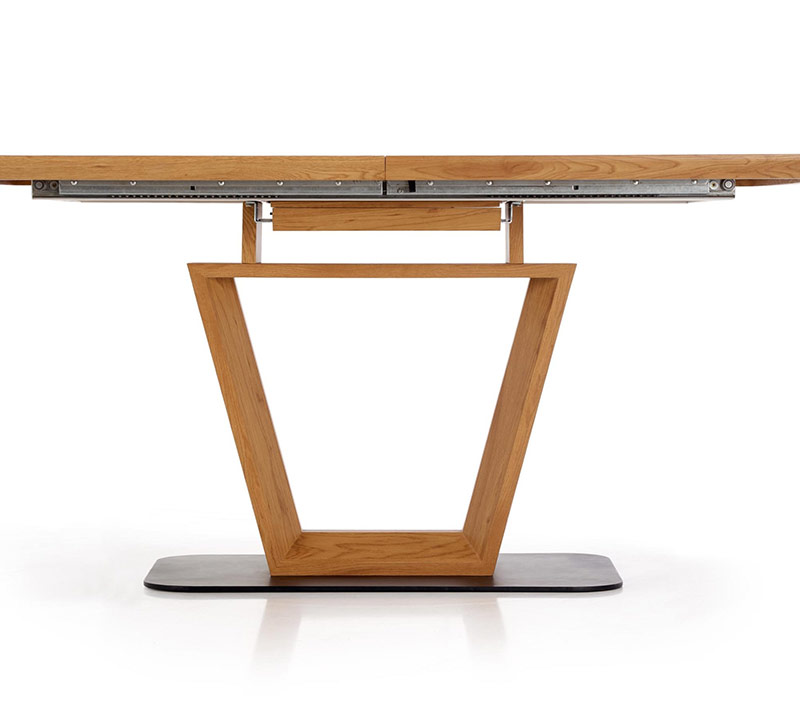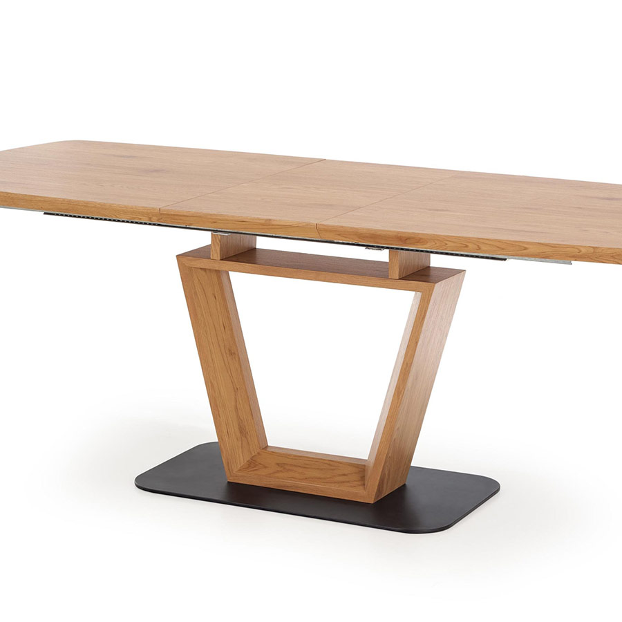 Разтегателна трапезна маса с нестандартен дизайн, в цвят златен дъб – модерна мебел, която ще внесе стил и класа в дома ви!