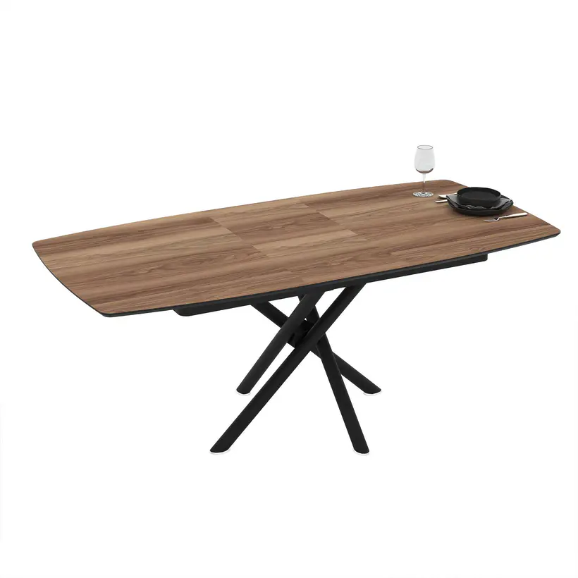 Разтегателна трапезна маса с плот в цвят орех и черна метална нестандартна основа, която съчетава стил и функционалност.