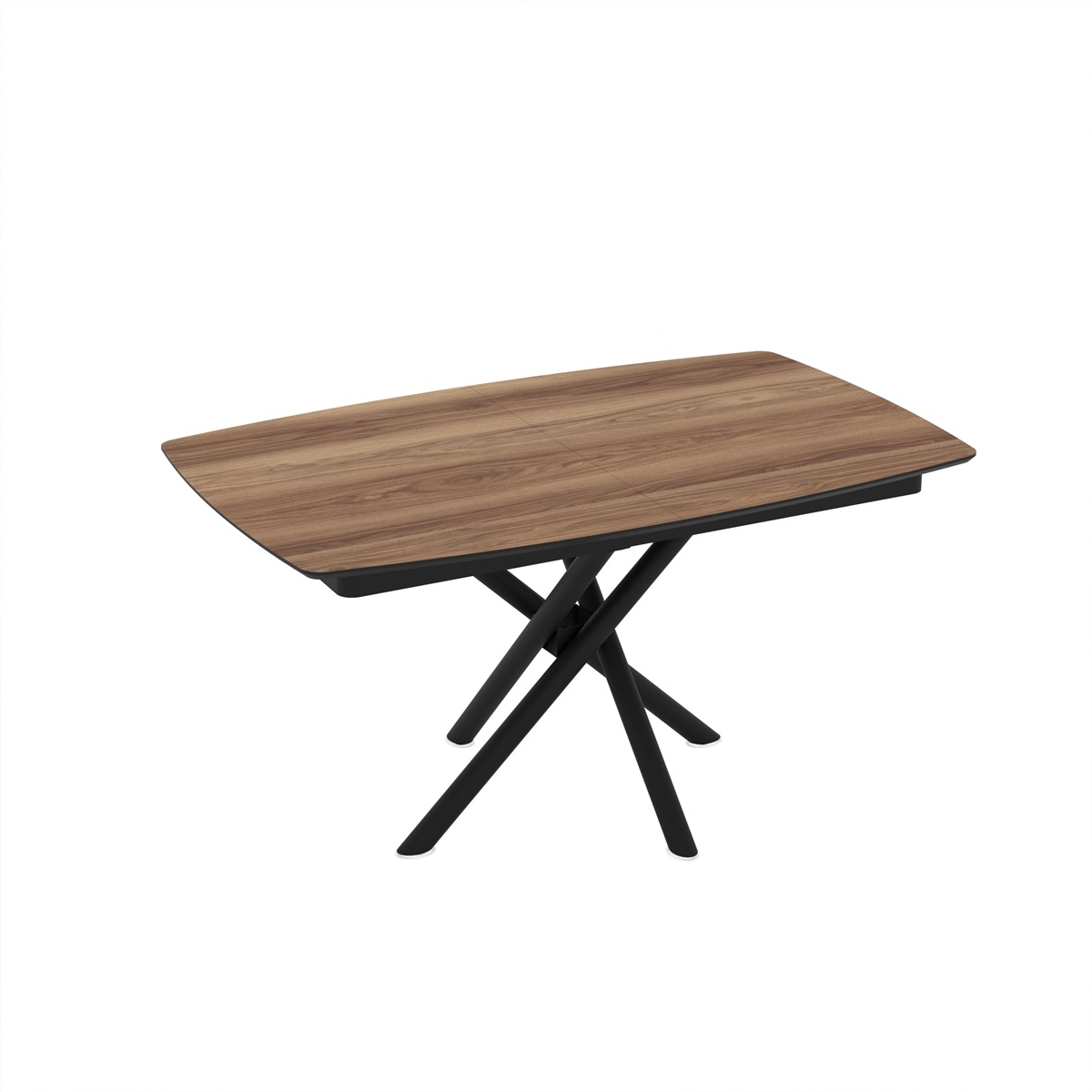Разтегателна трапезна маса с плот в цвят орех и черна метална нестандартна основа, която съчетава стил и функционалност.