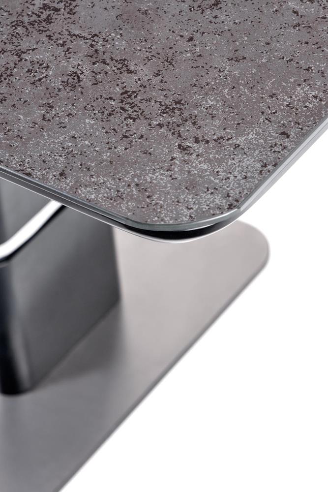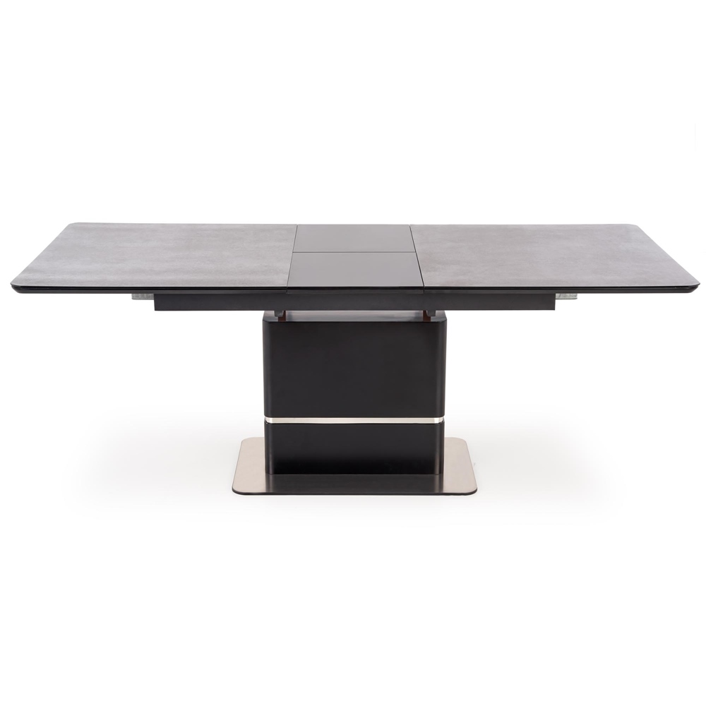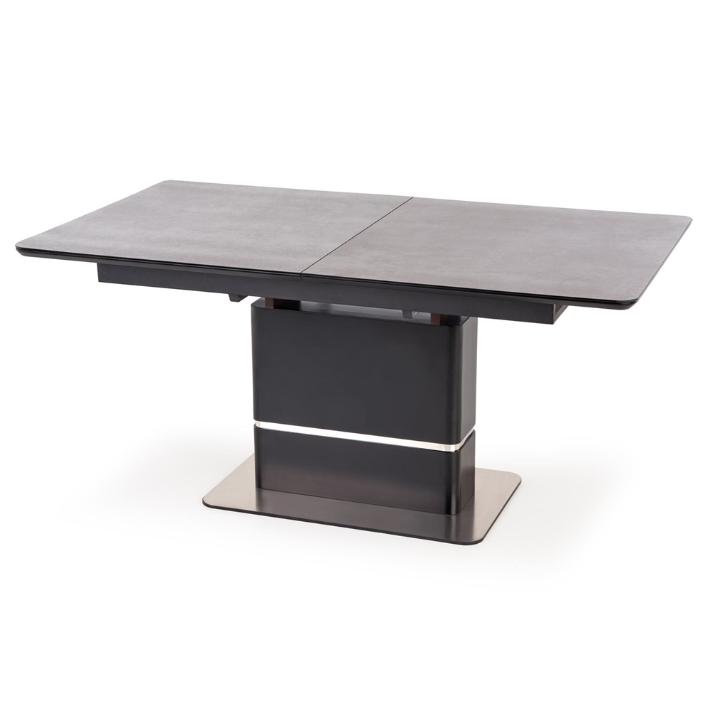 Разтегателна трапезна маса, изработена с лакиран плот от МДФ със стъклено покритие в сиво, разтегателен плот в тъмен нюанс и основа от прахово боядисана основа в черно.