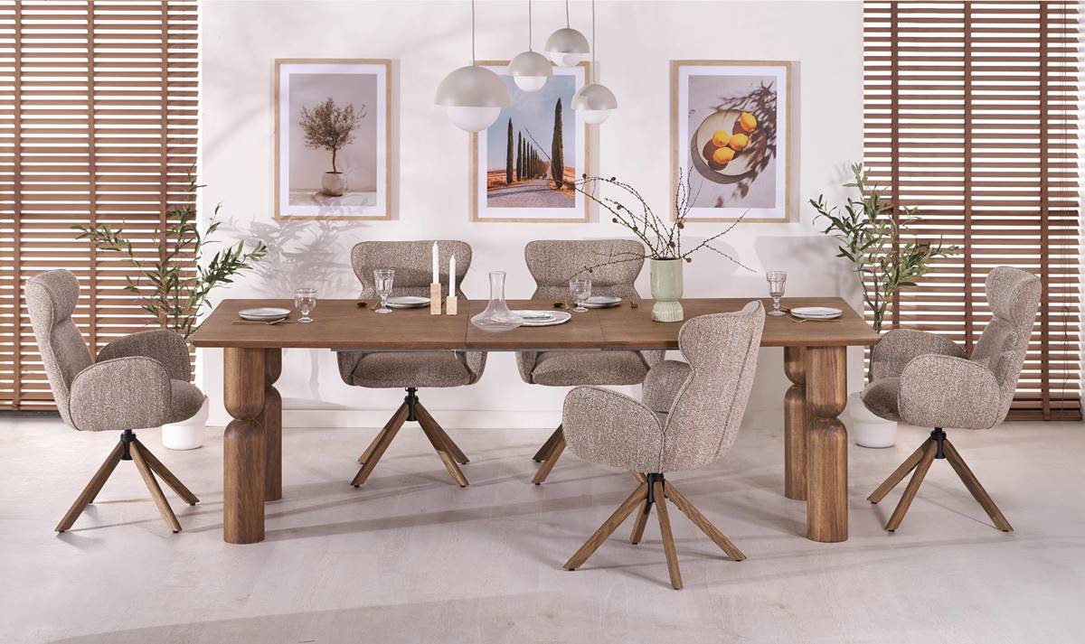 Разтегателна трапезна маса с правоъгълна форма в цвят светъл орех.