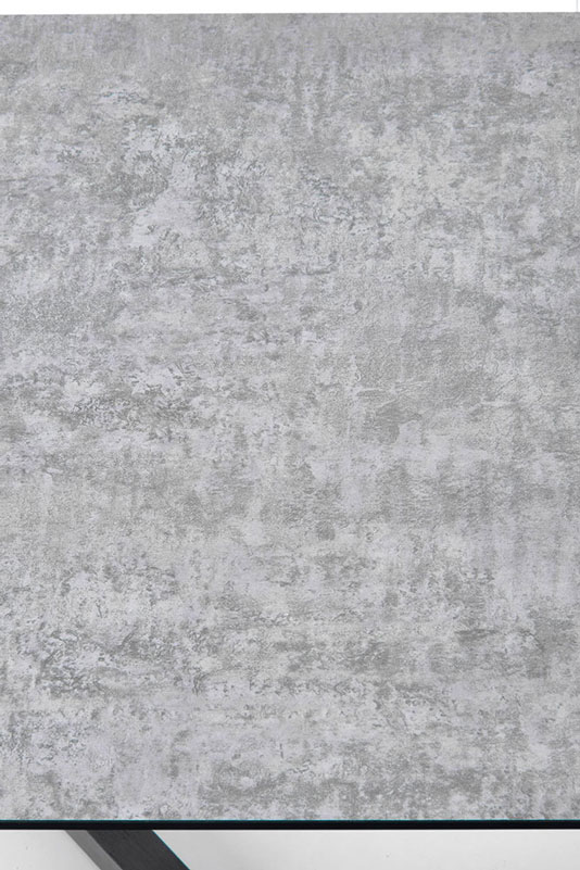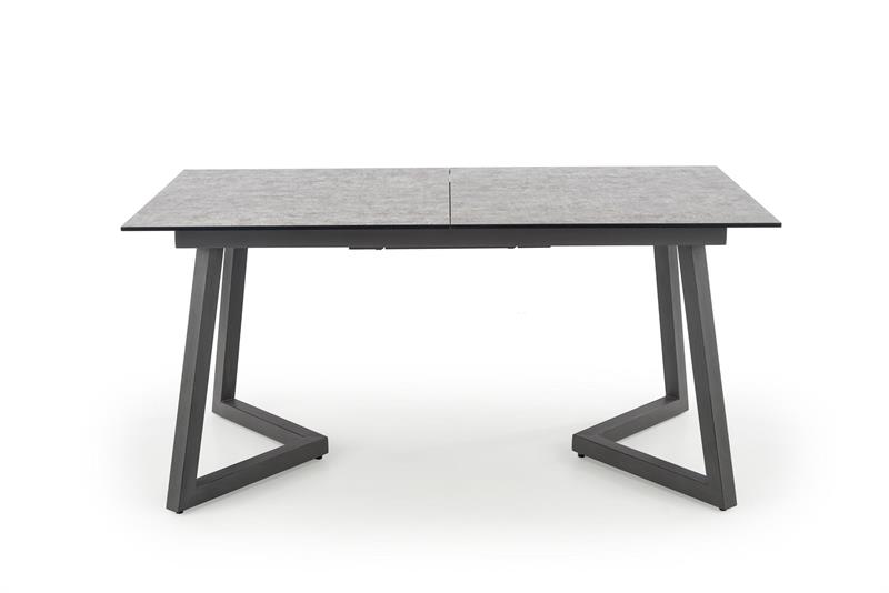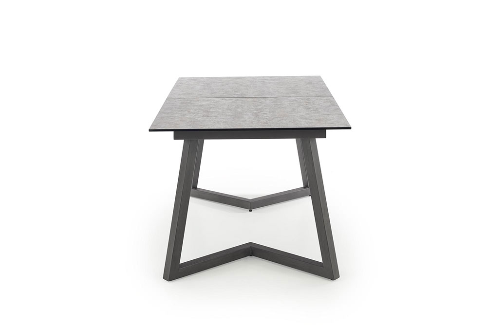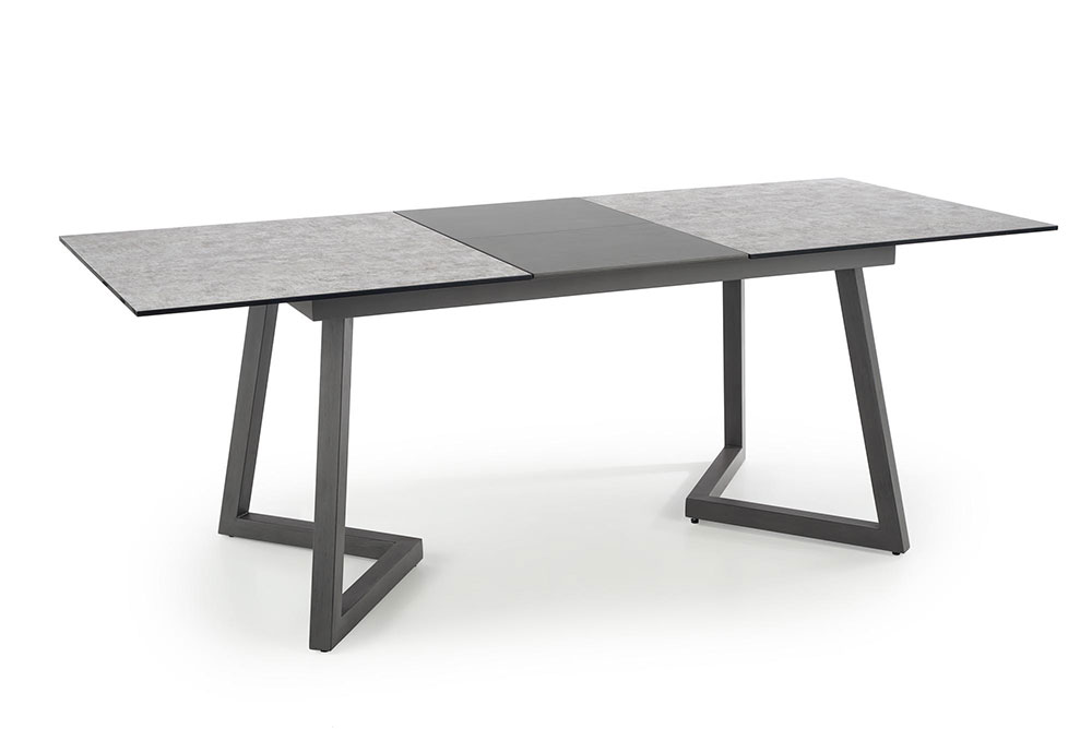 Разтегателна трапезна маса с правоъгълен плот от МДФ в светлосиво, разтегателна част в тъмносиво, със стъклено покритие и метална основа в тъмносив цвят.