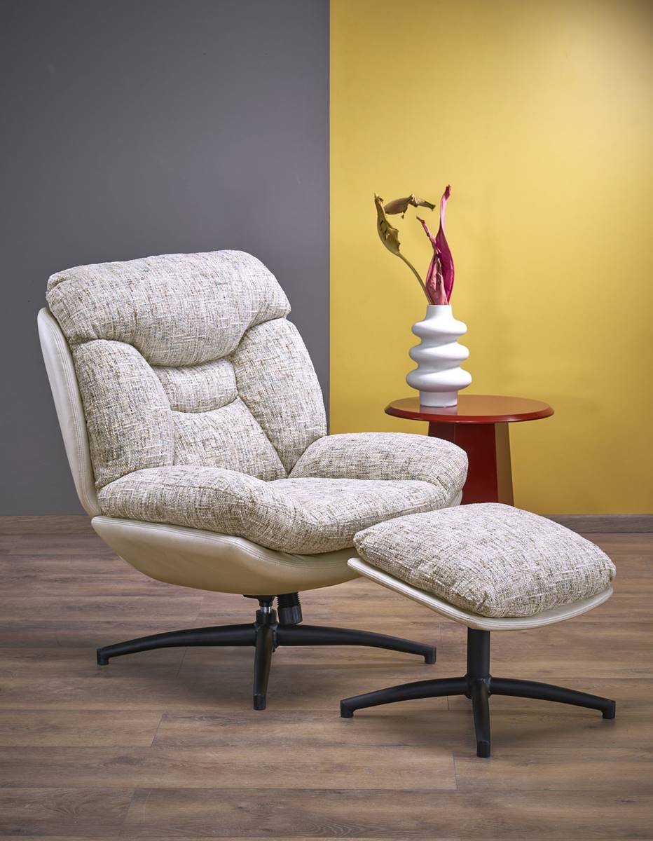 Изработено е с дамаска в пъстър бежов десен и детайли от еко кожа и е идеално допълнение към всяко пространство за релакс.