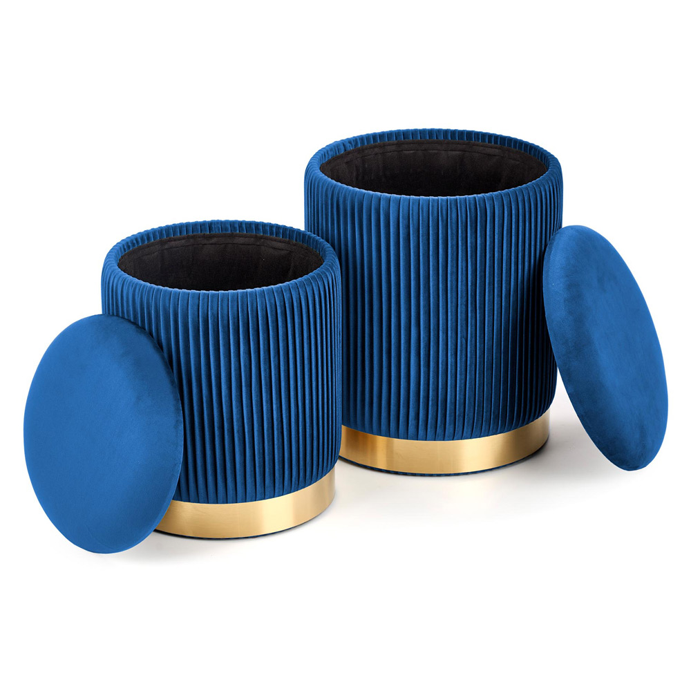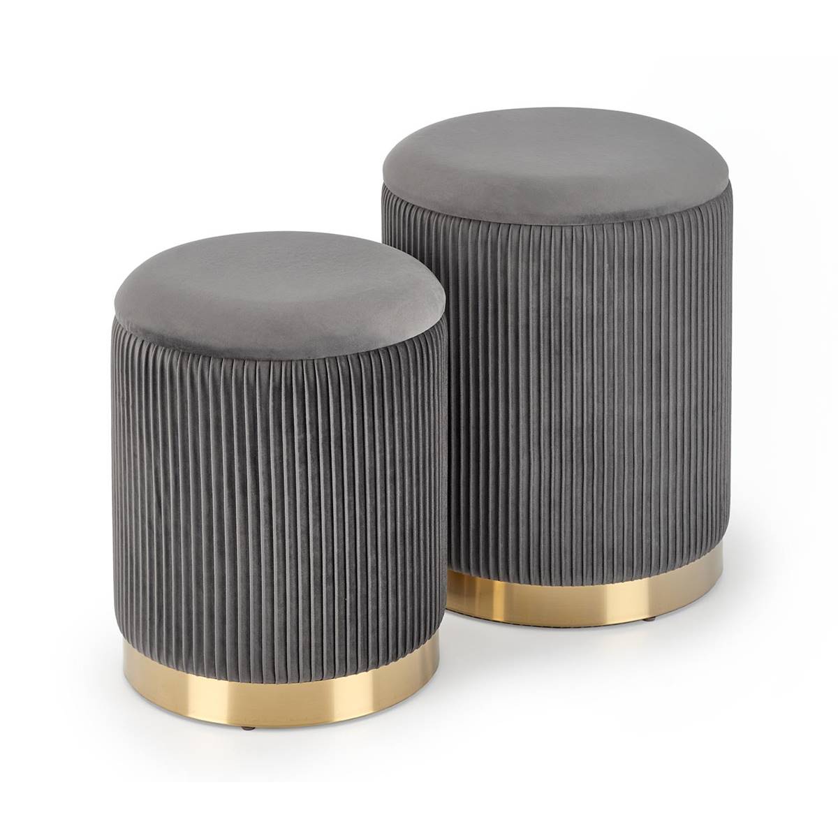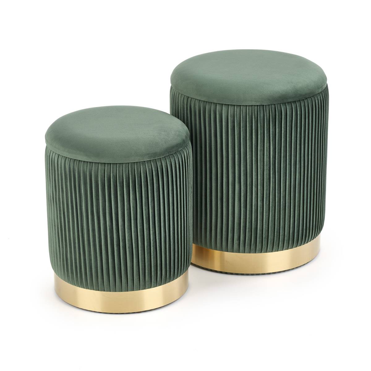 Сет от две различни по големина плюшени табуретки с място за съхранение и златиста основа, които се предлагат в три цвята – тъмнозелен, тъмносин и сив.