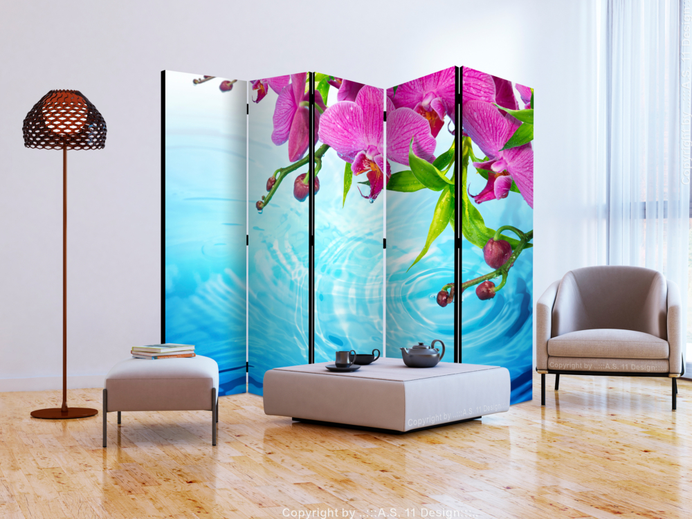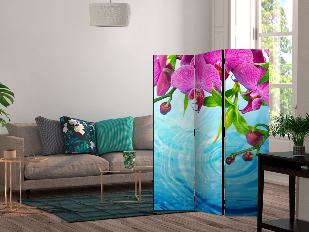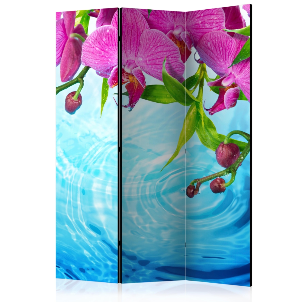 Този сгъваем декоративен параван с розови орхидеи над вода е оригинално допълнение към интериор, решен в модерен стил, студио за красота или спа център. Изработен е от дървена рамка с двустранен печат върху флизалиново платно. Благодарение на оригиналния мотив с качество на печата Full HD, този параван ще придаде неповторим чар на всяко помещение!