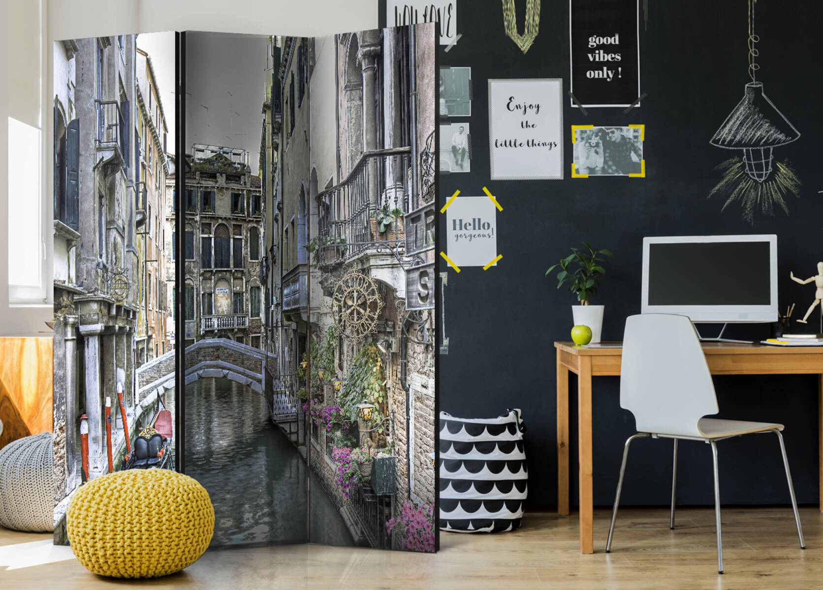 Този сгъваем декоративен параван, изобразяващ канал във Венеция, е оригинална декорация за всеки съвременен или винтидж интериор. Изработен е от дървена рамка с двустранен печат върху флизалиново платно. Благодарение на оригиналния мотив с качество на печата Full HD, този параван ще придаде неповторим чар на всяко помещение!