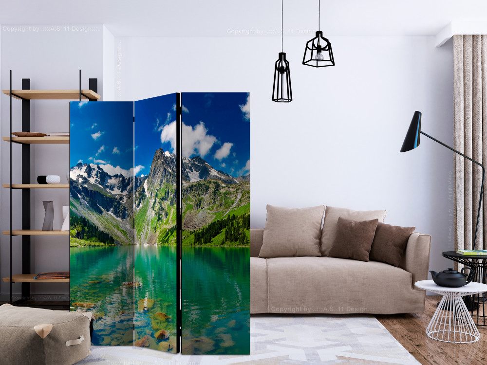 Този сгъваем двулицев параван с планински пейзаж и езеро е оригинална декорация за интериор, решен в модерен стил. Изработен е от дървена рамка с двустранен печат върху флизалиново платно. Благодарение на оригиналния мотив с качество на печата Full HD, този параван ще придаде неповторим чар на всяко помещение!