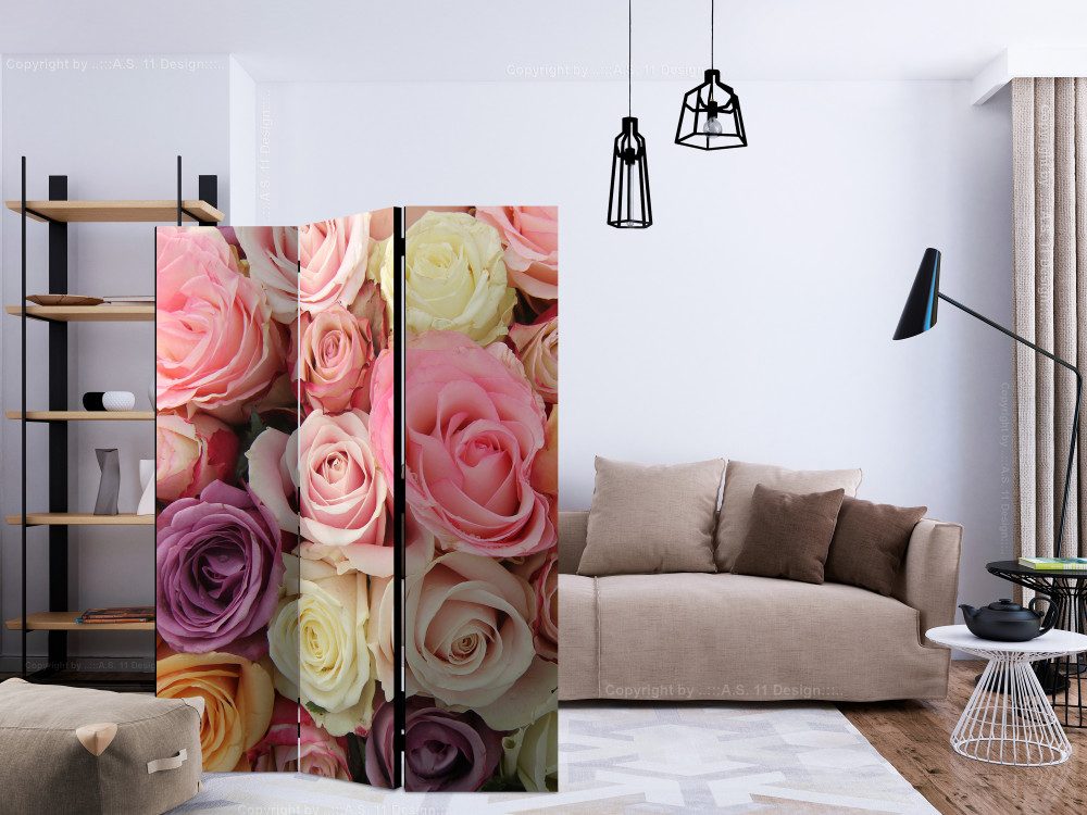 Този сгъваем двулицев параван с рози в пастелни нюанси е оригинална декорация за романтичен интериор. Изработен е от дървена рамка с двустранен печат върху флизалиново платно. Благодарение на оригиналния мотив с качество на печата Full HD, този параван ще придаде неповторим чар на всяко помещение!
