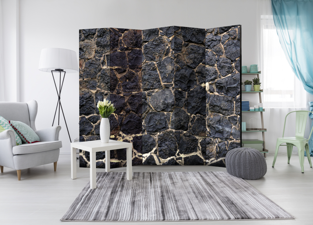 Характеристики на паравани за стая от GRANDecor Този сгъваем декоративен параван с 3D ефект на черни камъни като стена ще допълни чудесно всеки интериор, решен в скандинавски или индустриален стил. Изработен е от дървена рамка с двустранен печат върху флизалиново платно. Благодарение на оригиналния мотив с качество на печата Full HD, този параван ще придаде неповторим чар на всяко помещение!