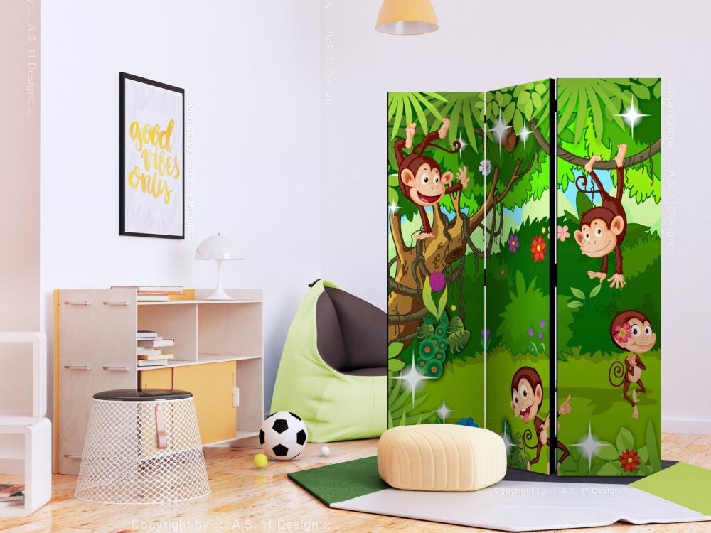 Характеристики на паравани за стая от GRANDecor Този сгъваем параван за детска стая със забавни маймунки в джунглата е красива декорация, която ще допълни чудесно пространството във всеки дом. Изработен е от дървена рамка с двустранен печат върху флизалиново платно. Благодарение на оригиналния мотив с качество на печата Full HD, този параван ще придаде неповторим чар на детската стая!
