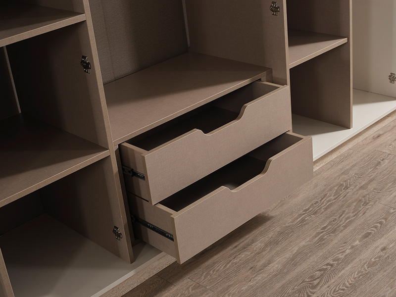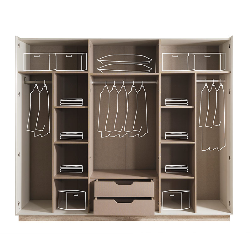 Вътрешното разпределение включва три лоста за закачалки, две чекмеджета и рафтове за подредба на различни типове облекло.