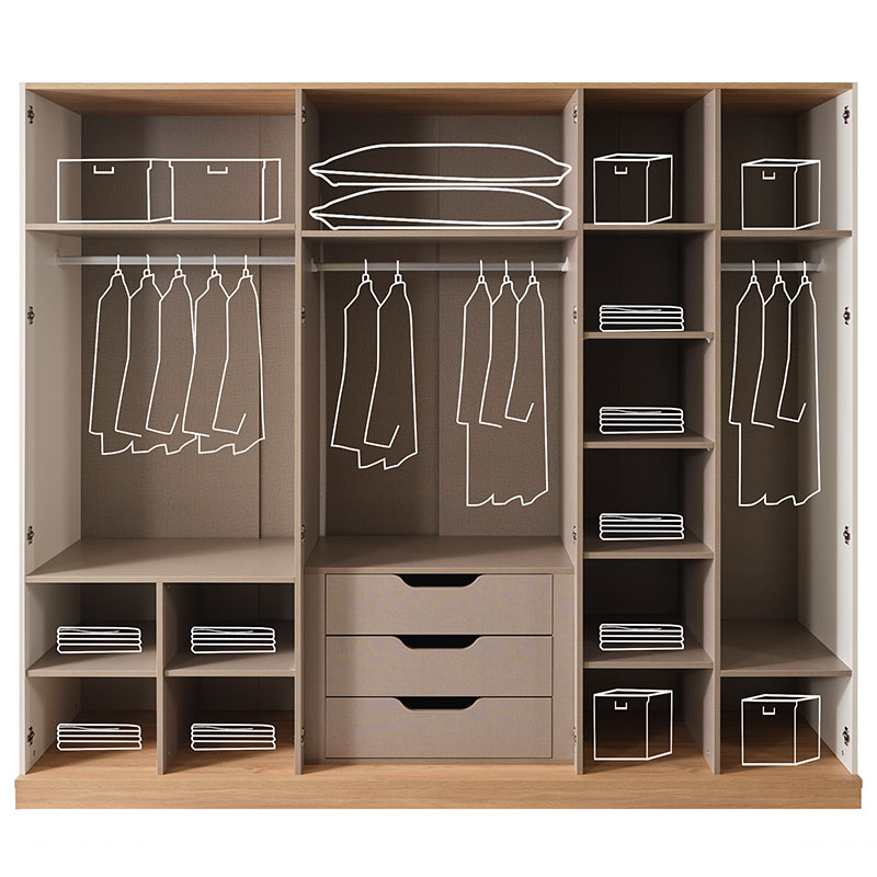 Вътрешното разпределение включва 3 лоста за закачалки, 3 чекмеджета и рафтове за вашите дрехи и аксесоари.