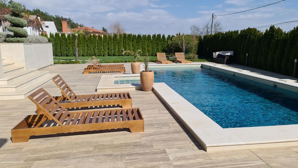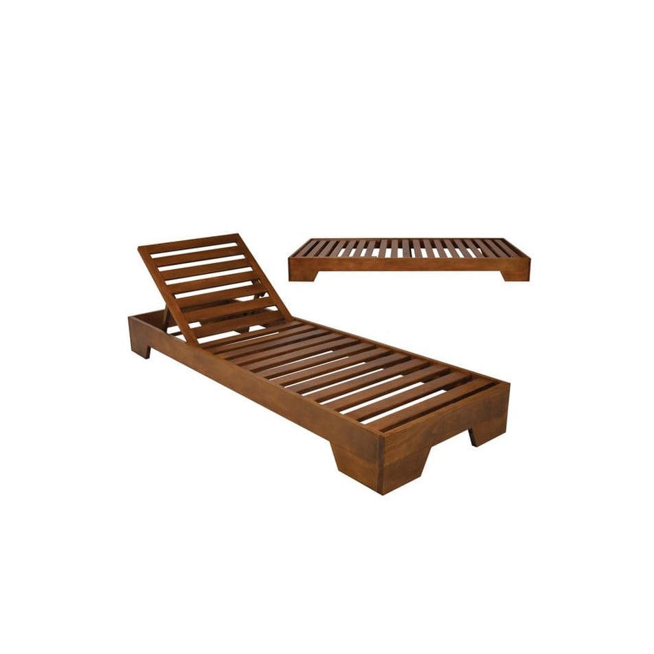 Стилен шезлонг, изработен от дърво в цвят орех с повдигащ се гръб.