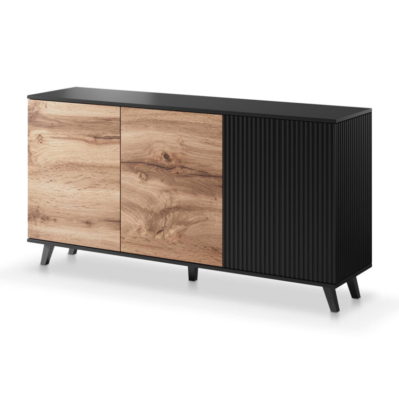 Широк шкаф с ефектен детайл от релефен МДФ, плот и крачета в черно, съчетани с дървесен цвят дъб вотан, модулна система Рандъм.