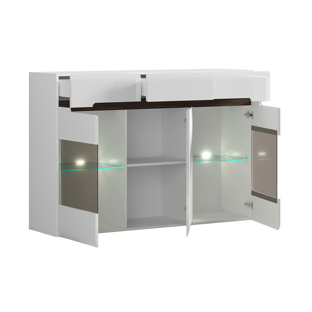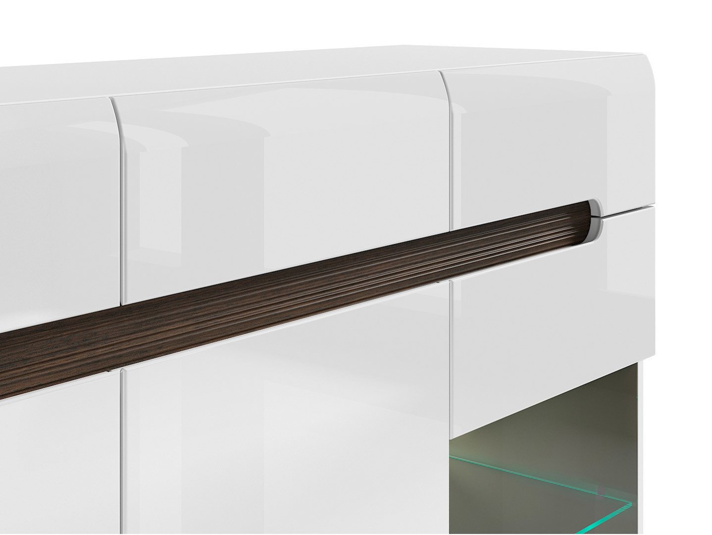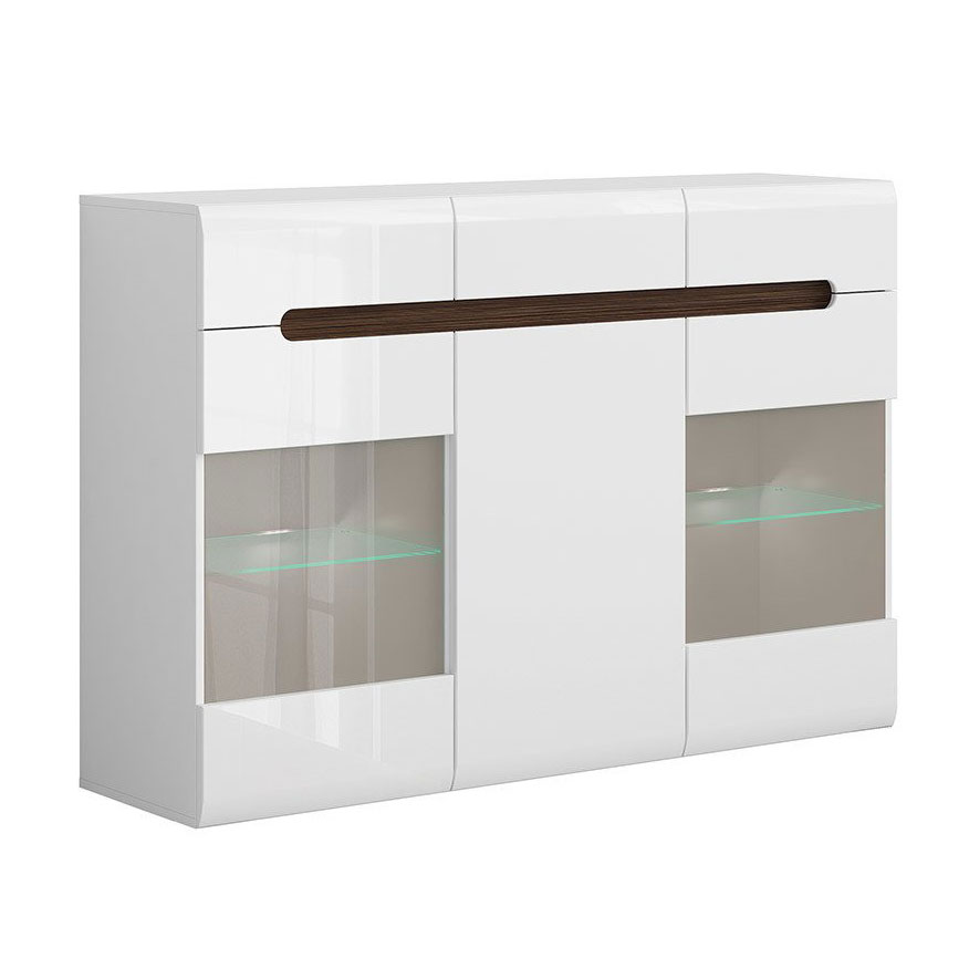 Широк шкаф от ПДЧ и МДФ с 2 стъклени витрини с LED осветление, вратичка и три чекмеджета, модулна система Ацтека. Предлага се с две декоративни ленти – двустранна (бял или черен гланц) и едностранна в цвят венге.