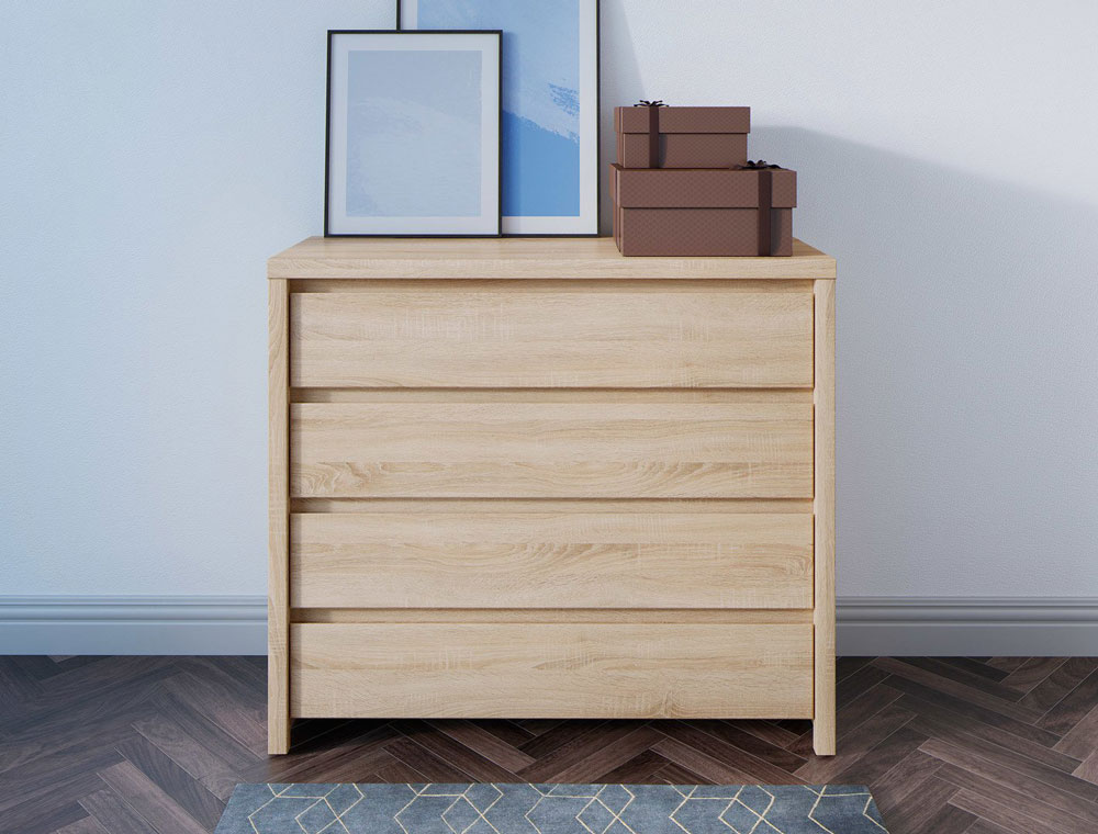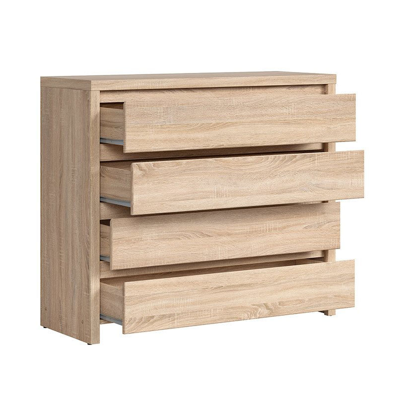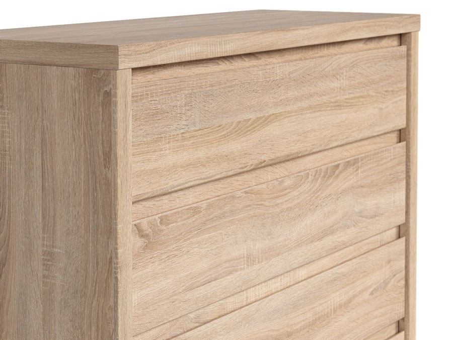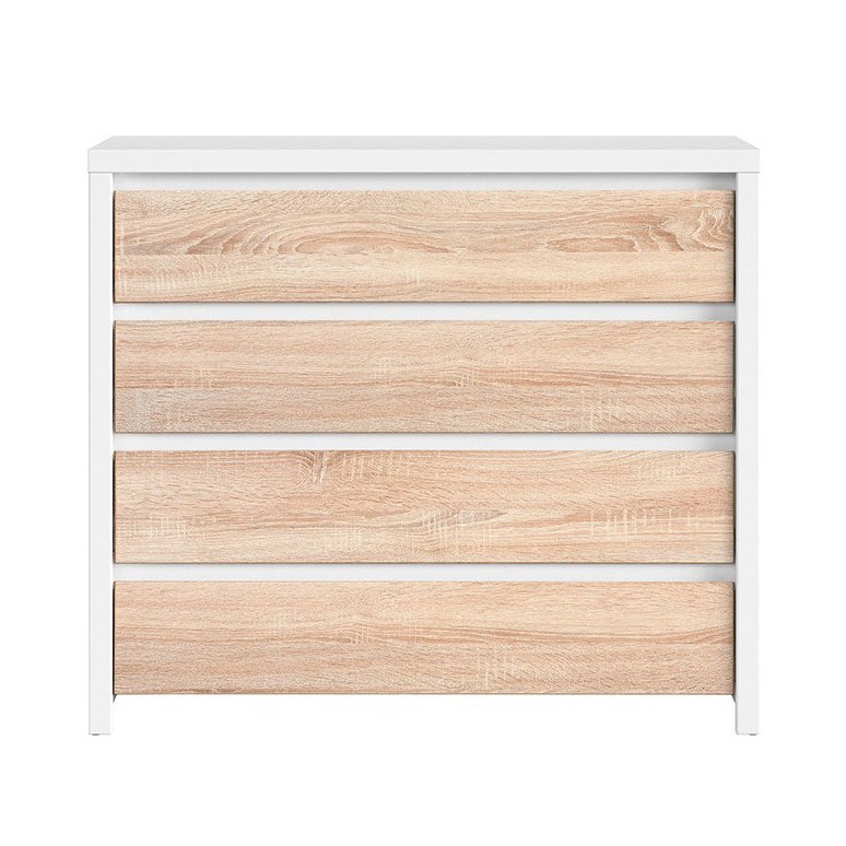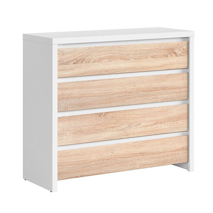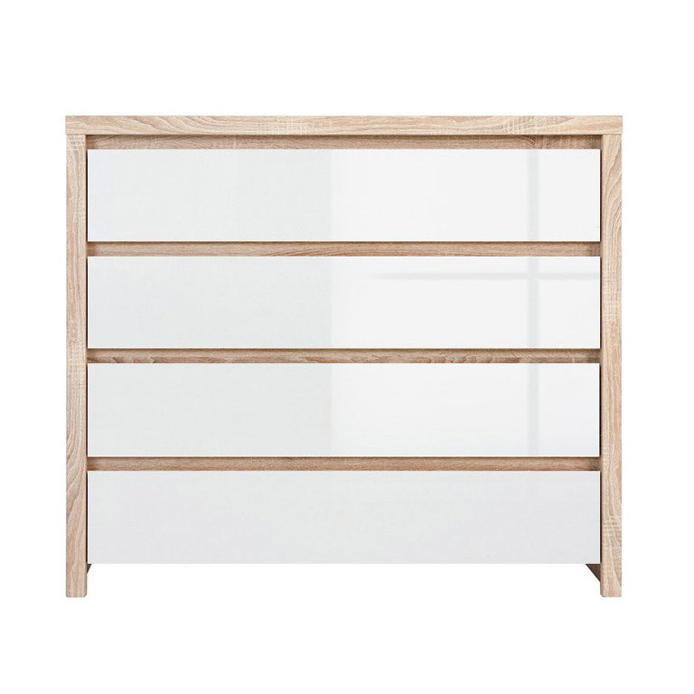 Широк скрин, изработен от ПДЧ с четири чекмеджета в три цветови варианта – дъб сонома, бял корпус с лицева част в дъб сонома, корпус в дъб сонома с лицева част в бял гланц, модулна система Каспиан Дъб.