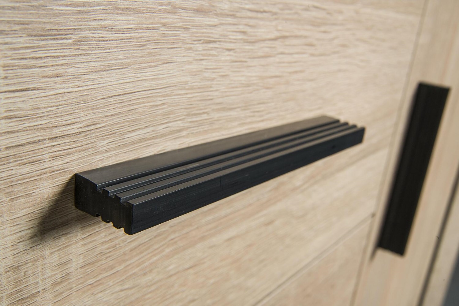 Акцентът на черните дръжки и кантове придава изискан вид на скрина.