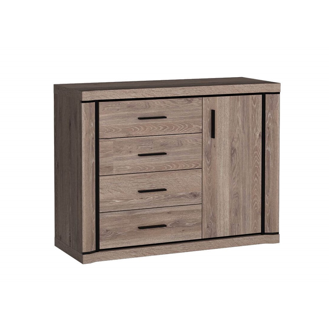 Разполага с четири удобни чекмеджета за подреждане на дрехи, документи или аксесоари, както и с едно шкафче с вратичка и рафт за допълнително съхранение.